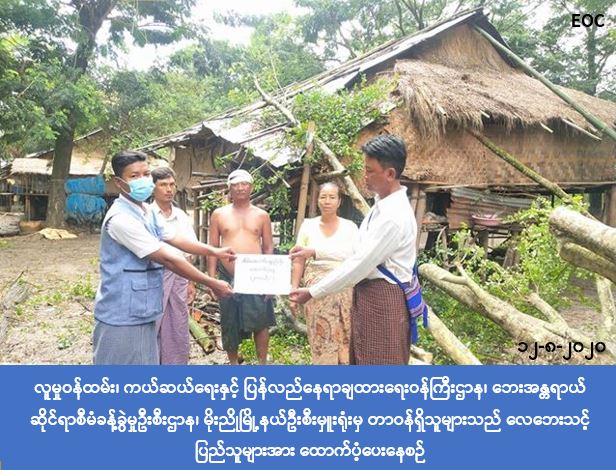 လူမှုဝန်ထမ်း၊ ကယ်ဆယ်ရေးနှင့် ပြန်လည်နေရာချထားရေးဝန်ကြီးဌာန၊ ဘေးအန္တရာယ်ဆိုင်ရာစီမံခန့်ခွဲမှုဦးစီးဌာန၊ မိုးညိုမြို့နယ်ဦးစီးမှူးရုံးမှ တာဝန်ရှိသူများသည် (၁၂-၈-၂၀၂၀)ရက်နေ့၌ ပဲခူးတိုင်းဒေသကြီး၊ သာယာဝတီခရိုင်၊ မိုးညိုမြို့နယ်၊ကျွန်းညိုကျေးရွာအုပ်စု၊ ကြံခင်းစုကျေးရွာတွင် ဖြစ်ပွားခဲ့သော လေဘေးမှ တစ်စိတ်တစ်ပိုင်း ပျက်စီး နေအိမ်(၁)လုံးအတွက် အိမ်ဆောက်ပစ္စည်းဖိုးထောက်ပံ့ငွေ (၂၀,၀၀၀)ကျပ်၊ စုစုပေါင်းထောက်ပံ့ငွေ (၂၀,၀၀၀) ကျပ်တို့ကို (၁၃-၈-၂၀၂၀)ရက်နေ့ (၁၁:၀၀)နာရီအချိန်တွင် ဘေးသင့်နေအိမ်၌ မိုးညိုမြို့နယ်အထွေထွေ အုပ်ချုပ် ရေးဦးစီးဌာနမှ တာဝန်ရှိသူများ၊ မြို့နယ်မီးသတ်ဦးစီးဌာနမှ တာဝန်ရှိသူများ၊မြို့နယ်ကြက်ခြေနီတပ်ဖွဲ့ဝင်များ၊ မြို့နယ်ပြန်ဆက်ရုံးမှတာဝန်ရှိသူများ၊ ကျေးရွာအုပ်ချုပ်ရေးမှူးများနှင့်အတူ ပြည်သူလက်ဝယ်အရောက် ထောက်ပံ့ ပေးအပ်ခဲ့ကြောင်း သိရှိရပါသည်။