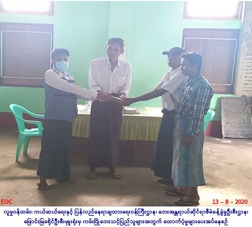 လူမှုဝန်ထမ်း၊ ကယ်ဆယ်ရေးနှင့် ပြန်လည်နေရာချထားရေး ဝန်ကြီးဌာန၊ ဘေးအန္တရာယ်ဆိုင်ရာစီမံခန့်ခွဲမှုဦးစီးဌာန၊ မြောင်းမြ ခရိုင်ဦးစီးမှူးရုံးမှ တာဝန်ရှိသူများသည် မြောင်းမြခရိုင်၊ ဝါးခယ်မမြို့နယ်၊ ကမ်းပြိုကျေးရွာအုပ်စု၊ ရေကျော်ကျေးရွာတွင် (၇-၈-၂၀၂၀)ရက်နေ့၌ ဖြစ်ပွားခဲ့သော ကမ်းပြိုဘေးကြောင့် ကြိုတင်ရွှေ့ပြောင်းခဲ့ရသော အိမ်ထောင်စု(၂)စုမှ လူဦးရေ(၈)ဦးအတွက် အိမ်ဆောက်ပစ္စည်းရန်ပုံငွေ (၂၀၀၀၀ဝ/-)၊ ဆန်ရိက္ခာရန်ပုံငွေ (၁၆၈၀ဝ/-)၊ စုစုပေါင်းရန်ပုံငွေ (၂၁၆၈၀ဝ/-)ကျပ်အား (၁၃-၈-၂၀၂၀)ရက်နေ့ (၁၃:၀၀) နာရီအချိန်တွင် ရွှေလောင်မြို့၊ ရပ်ကွက်အုပ်ချုပ်ရေးမှူးရုံးတွင် ဘေးသင့်ပြည်သူများထံ သွားရောက် ထောက်ပံ့ပေးအပ်ခဲ့ပါကြောင်း သတင်းရရှိပါသည်။
