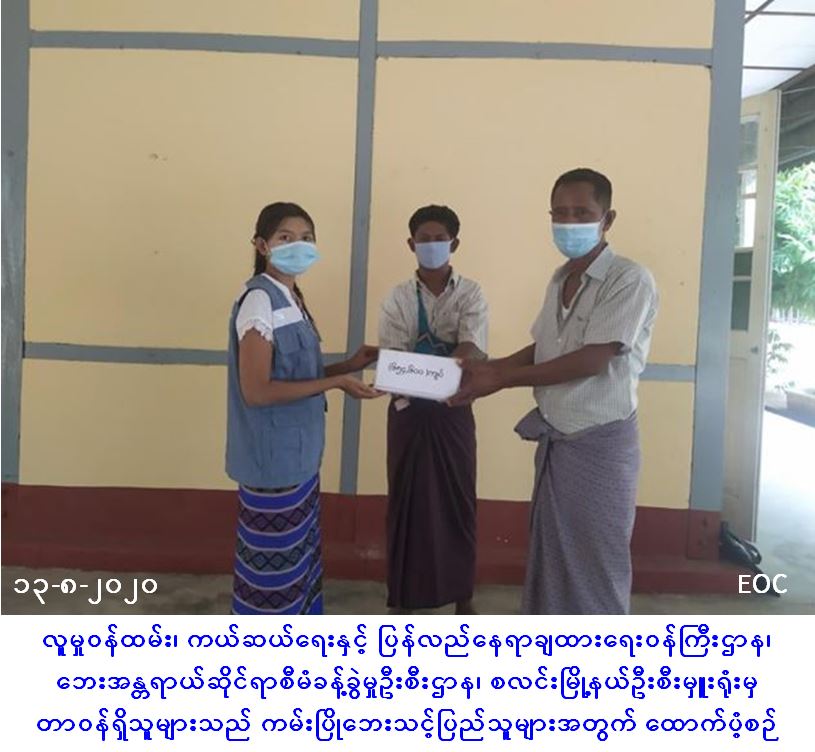 လူမှုဝန်ထမ်း၊ ကယ်ဆယ်ရေးနှင့် ပြန်လည်နေရာချထားရေးဝန်ကြီးဌာန၊ ဘေးအန္တရာယ်ဆိုင်ရာစီမံခန့်ခွဲမှုဦးစီးဌာန၊ စလင်းမြို့နယ်ဦးစီးမှူးရုံးမှ တာဝန်ရှိသူများသည် မင်းဘူးခရိုင်၊ စလင်းမြို့နယ်၊ ကျောက်ရဲကျွန်းကျေးရွာအုပ်စု၊ ကျောက်ရဲကျွန်းကျေးရွာ၌ (၁၁-၈-၂၀၂၀) ရက်နေ့တွင် ဧရာဝတီမြစ်ရေတိုက်စား၍ ကမ်းပါးပြိုကျနိုင်သည့်အခြေအနေကြောင့် ကြိုတင်ပြောင်းရွှေ့ခဲ့သည့်အိမ်ခြေ(၆)လုံး၊ အိမ်ထောင်စု(၆)စုတို့အတွက် အိမ်ဆောက်ပစ္စည်းဖိုး (၆၀၀,၀၀၀) ကျပ်၊ လူဦးရေ (၂၆) ဦးအတွက် ဆန်ရိက္ခာ (၇)ရက်စာ (၅၄,၆၀၀)ကျပ်၊ စုစုပေါင်းထောက်ပံ့ငွေ(၆၅၄,၆၀၀) ကျပ်တိတိအား (၁၃-၈-၂၀၂၀)ရက်နေ့၊ (၁၀:၀၀) နာရီအချိန်တွင် ကျေးရွာအုပ်ချုပ်ရေးမှူးနှင့်အတူ ဘေးသင့်ပြည်သူများ လက်ဝယ်အရောက် သွားရောက်ထောက်ပံ့ပေးအပ်ခဲ့ကြောင်း သတင်းရရှိပါသည်။