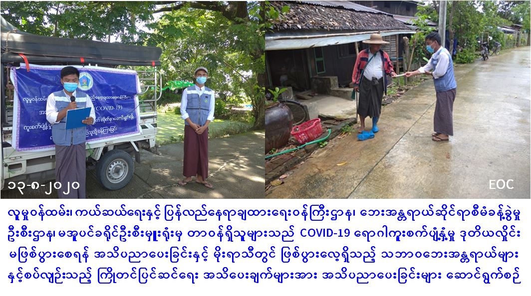 လူမှုဝန်ထမ်း၊ ကယ်ဆယ်ရေးနှင့် ပြန်လည်နေရာချထားရေးဝန်ကြီးဌာန၊ ဘေးအန္တရာယ်ဆိုင်ရာစီမံခန့်ခွဲမှုဦးစီးဌာန၊ မအူပင်ခရိုင်ဦးစီးမှူးရုံးမှ တာဝန်ရှိသူများသည် (၁၃-၈-၂၀၂၀)ရက်နေ့တွင် ပန်းတနော်မြို့နယ်၊ ကဇင်းငူကျေးရွာအုပ်စုရှိ စိန်ကျွန်းကျေးရွာ၊ သမိုင်းကျေးရွာ၊ လက်ကြားကျေးရွာနှင့် စံကျောင်းကျေးရွာတို့၌ COVID-19 ရောဂါကူးစက်ပျံ့နှံ့မှု ဒုတိယလှိုင်း မဖြစ်ပွားစေရန် အများပြည်သူအလွယ်တကူသိရှိလိုက်နာဆောင်ရွက်ရန်အချက်များနှင့် မိုးရာသီတွင် ဖြစ်ပွားလေ့ရှိသည့် သဘာဝဘေးအန္တရာယ်များနှင့်စပ်လျဉ်းသည့် ကြိုတင်ပြင်ဆင်ရေး အသိပေးချက်များကို အသိပညပေးခြင်းများ ဆောင်ရွက်ခြင်းနှင့် ဘေး (၈)မျိုးပါ လက်ကမ်းစာစောင်များ ဖြန့်ဝေပေးခြင်းများ ဆောင်ရွက်ခဲ့ကြောင်း သတင်းရရှိပါသည်။