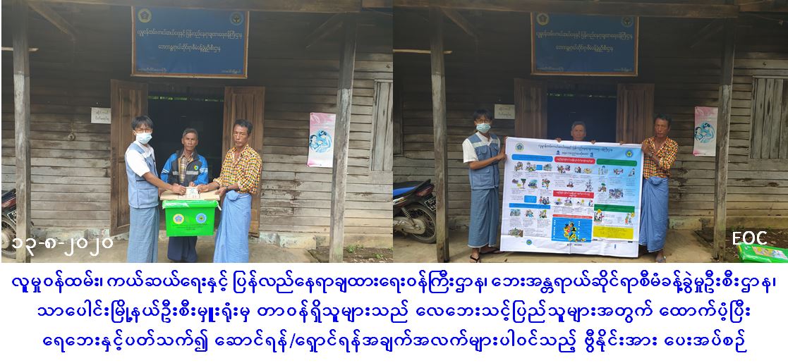 လူမှုဝန်ထမ်း၊ ကယ်ဆယ်ရေးနှင့် ပြန်လည်နေရာချထားရေးဝန်ကြီးဌာန၊ ဘေးအန္တရာယ်ဆိုင်ရာစီမံခန့်ခွဲမှုဦးစီးဌာန၊ သာပေါင်းမြို့နယ်ဦးစီးမှူးရုံးမှ တာဝန်ရှိသူများသည် သာပေါင်းမြို့နယ်၊ ကျုံတဒွန်းကျေးရွာအုပ်စု၊ အရှေ့ထန်းတပင်ကျေးရွာ၌ (၉-၈-၂၀၂၀) ရက်နေ့တွင် ဖြစ်ပွားခဲ့သော လေဘေးကြောင့် ပြိုကျပျက်စီးခဲ့သည့်နေအိမ်(၁)လုံးအတွက် အိမ်ဆောက်ပစ္စည်းဖိုး (၁၀၀၀၀ဝိ/-)၊ လူဦးရေ(၄)ဦးအတွက် ဆန်ရိက္ခာ(၇)ရက်စာရန်ပုံငွေ(၈၄၀ဝိ/-)၊ စုစုပေါင်းရန်ပုံငွေ(၁၀၈၄၀ဝိ/-)နှင့် ကယ်ဆယ်ရေးပစ္စည်း(၁၆)မျိုး (၁) အိမ်ထောင်စာကိုလည်းကောင်း၊ ရေဘေးနှင့်ပတ်သက်၍ ဆောင်ရန်/ရှောင်ရန်အချက်အလက်များပါဝင်သည့် ဗွီနိုင်း(၁)ခုအား (၁၃-၈-၂၀၂၀) ရက်နေ့၊ (၁၀:၀၀) နာရီအချိန်တွင် ကျေးရွာအုပ်ချုပ်ရေးမှူးနှင့်တကွ တာဝန်ရှိသူများ၏ရှေ့မှောက်၌ ဘေးသင့်ပြည်သူများ၏လက်ဝယ်သို့ ထောက်ပံ့ပေးအပ်ခဲ့ကြောင်း သတင်းရရှိပါသည်။
