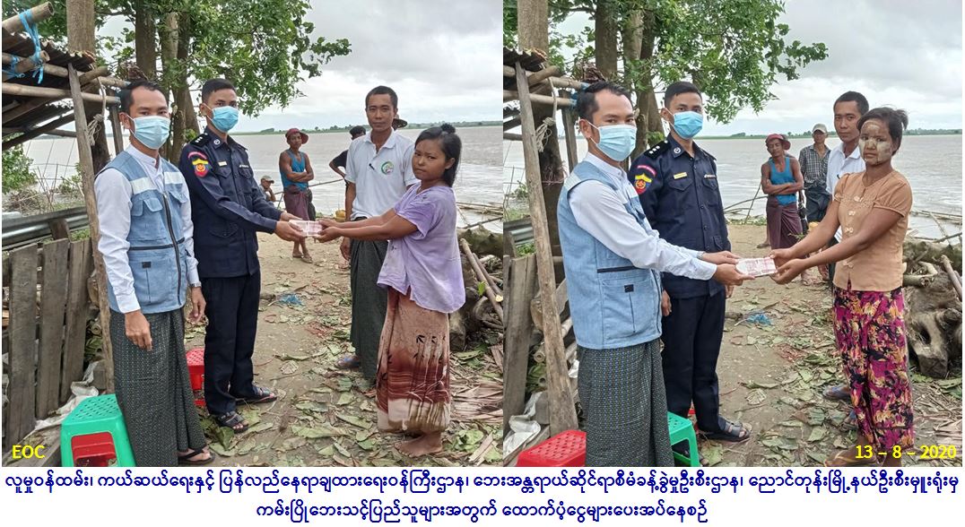 လူမှုဝန်ထမ်း၊ ကယ်ဆယ်ရေးနှင့် ပြန်လည်နေရာချထားရေး ဝန်ကြီးဌာန၊ ဘေးအန္တရာယ်ဆိုင်ရာစီမံခန့်ခွဲမှုဦးစီးဌာန၊ ညောင်တုန်း မြို့နယ်ဦးစီးမှူးရုံးမှ တာဝန်ရှိသူများသည် (၁၃.၈.၂၀၂၀) ရက်နေ့တွင် ညောင်တုန်းမြို့နယ်၊ ဂန်ချောင်းကျေးရွာအုပ်စု၊ မာယူ ချောင်းဖျားကျေးရွာ၌ ဖြစ်ပွားခဲ့သော ကမ်းပြိုဘေးကြောင့် ကြိုတင်ဖျက်သိမ်းပြောင်းရွှေ့ခဲ့သည့် နေအိမ် (၃) လုံး၊ အိမ်ထောင်စု (၃) မှ လူဦးရေ (၈)ဦးအတွက် ဆန်ရိက္ခာ(၇)ရက်စာရန်ပုံငွေ (၁၆၈၀၀/-)ကျပ်၊ အိမ်ဆောက်ပစ္စည်းဖိုးရန်ပုံငွေ (၃၀၀၀၀၀/-) ကျပ်၊ စုစုပေါင်းရန်ပုံငွေ (၃၁၆၈၀၀/-) ကျပ်အား (၁၃.၈.၂၀၂၀) ရက်နေ့ (၁၄:၀၀) နာရီအချိန်တွင် ညောင်တုန်းမြို့နယ် မီးသတ် ဦးစီးဌာန၊ မြို့နယ်မီးသတ်ဦးစီးမှူး၊ ကျေးရွာတာဝန်ရှိသူများနှင့်အတူ ဘေးသင့်ပြည်သူများလက်ဝယ် အရောက်ကွင်းဆင်း ထောက်ပံ့ခဲ့ပါကြောင်း သတင်းရရှိပါသည်။