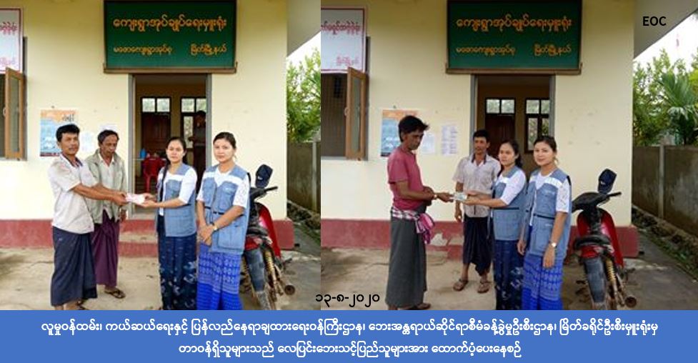 (၁၂-၈-၂၀၂၀)ရက်နေ့၌ မိုးသည်းထန်စွာရွာသွန်းပြီး လေပြင်းတိုက်ခတ်မှုကြောင့် မဇောကျေးရွာအုပ်စု၊ လက်မဲ ကျေးရွာတွင် တစ်စိတ်တစ်ပိုင်းပျက်စီးသွားသော အိမ်ခြေ(၁)လုံးအတွက် အိမ်ဆောက်ပစ္စည်းဖိုး (၉၀,၀၀၀) ကျပ်၊ လူဦးရေ(၈)ဦးအတွက်ဆန်ဖိုး (၁၆,၈၀၀)ကျပ်၊ ရှမ်းထိန်ကျေးရွာတွင် တစ်စိတ်တစ်ပိုင်းပျက်စီးနေအိမ်(၁)လုံး အတွက် အိမ်ဆောက်ပစ္စည်း ဖိုး(၅၀,၀၀၀)ကျပ်၊ လူဦးရေ (၄) ဦးအတွက် ဆန်ဖိုး (၇)ရက်စာ (၈,၄၀၀)ကျပ် စုစုပေါင်းထောက်ပံ့ငွေ (၁၆၅,၂၀၀) ကျပ်တို့ကို (၁၃-၈-၂၀၂၀) ရက်နေ့တွင် လူမှုဝန်ထမ်း၊ ကယ်ဆယ်ရေးနှင့် ပြန်လည်နေရာချထားရေးဝန်ကြီးဌာန၊ ဘေးအန္တရာယ်ဆိုင်ရာစီမံခန့်ခွဲမှုဦးစီးဌာန၊ မြိတ်ခရိုင်ဦးစီးမှူးရုံးမှ တာဝန်ရှိ သူများက ထောက်ပံ့ပေးခဲ့ကြောင်း သိရှိရပါသည်။