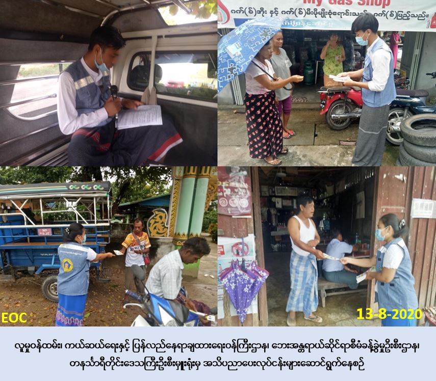 လူမှုဝန်ထမ်း၊ ကယ်ဆယ်ရေးနှင့် ပြန်လည်နေရာချထားရေးဝန်ကြီးဌာန၊ ဘေးအန္တရာယ်ဆိုင်ရာ စီမံခန့်ခွဲမှုဦးစီးဌာန၊ တနင်္သာရီတိုင်းဒေသကြီးဦးစီးမှူးရုံးမှ တာဝန်ရှိသူများသည် (၁၃-၈-၀၂၀) ရက်နေ့တွင် ထားဝယ်မြို့နယ်အတွင်းရှိ ပခပ်ကျေးရွာနှင့် ဝကုန်းကျေးရွာတို့တွင် Covid-19 အသက်ရှုလမ်းကြောင်းဆိုင်ရာရောဂါနှင့်ပက်သက်၍ လိုက်နာဆောင်ရွက်ရမည့်အချက်များနှင့် မိုးရာသီကာလသို့ ရောက်ရှိလာပြီဖြစ်သည့်အတွက် ရေဘေး၊ မြေပြိုဘေးနှင့် မိုးကြိုးဘေးစသည့် သဘာဝဘေး အန္တရာယ်များနှင့်ပက်သက်သည့် ဆောင်ရန်/ရှောင်ရန်အချက်များအား လော်စပီကာဖြင့် ပြည်သူသို့အသိပညာပေးပန်ကြားခြင်းများ လှည့်လည်ဆောင်ရွက်ခဲ့ပြီး လက်ကမ်းစာစောင်များဝေငှခဲ့ကြောင်း သတင်းရရှိပါသည်။