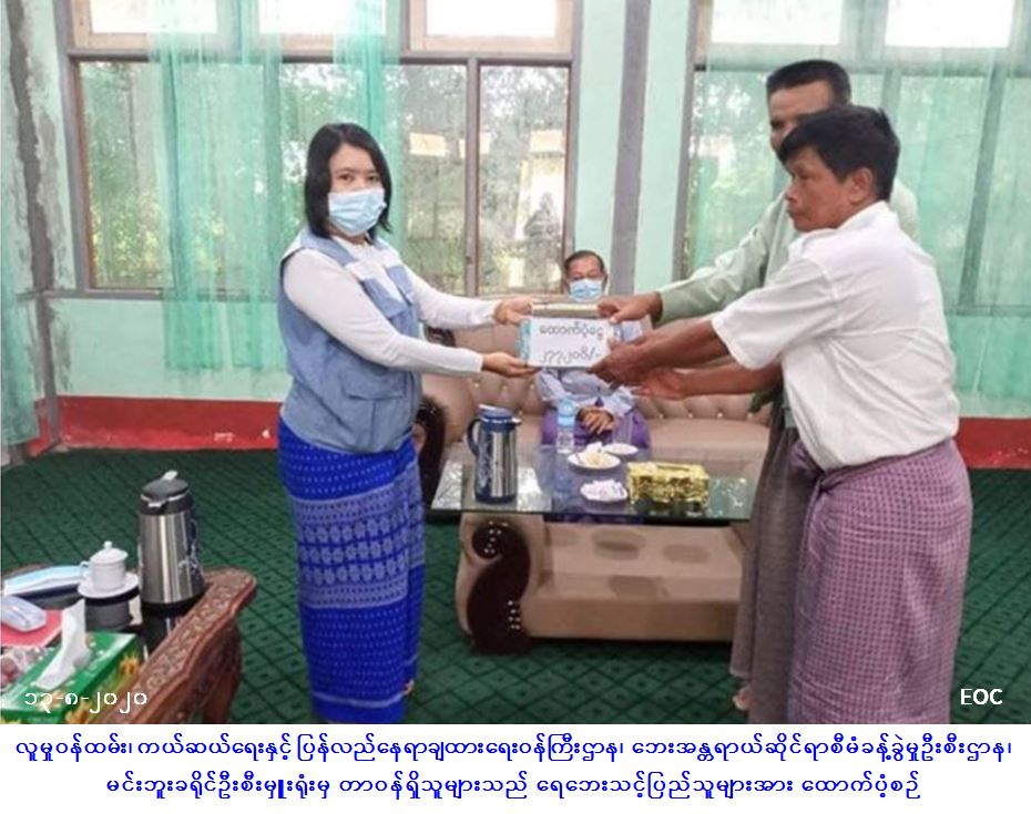 လူမှုဝန်ထမ်း၊ ကယ်ဆယ်ရေးနှင့် ပြန်လည်နေရာချထားရေးဝန်ကြီးဌာန၊ ဘေးအန္တရာယ် ဆိုင်ရာစီမံခန့်ခွဲမှုဦးစီးဌာန၊ မင်းဘူးခရိုင်ဦးစီးမှူးရုံးမှ တာဝန်ရှိသူများသည် မင်းဘူးခရိုင်၊ ပွင့်ဖြူမြို့နယ်၊ ငါးခြောက်ကျွန်း(ရေလယ်ကျွန်း)တွင် (၁-၈-၂၀၂၀)ရက်နေ့၌ ဖြစ်ပွားခဲ့သော ဧရာဝတီမြစ်ရေဝင်ရောက်မှုကြောင့် ရေဘေးသင့်အိမ်ခြေ(၃၅)လုံး၊ အိမ်ထောင်စု(၃၅)စုတို့မှ လူဦးရေ(၁၃၂)ဦးတို့အတွက် ဆန်ရိက္ခာ(၇)ရက်စာ စုစုပေါင်းထောက်ပံ့ငွေ(၂၇၇,၂၀၀ိ/-) ကျပ်အား (၁၃-၈-၂၀၂၀)ရက်နေ့၊ (၁၃:၀၀)နာရီအချိန်တွင် အထွေထွေအုပ်ချုပ်ရေးဦးစီးဌာန မှ တာဝန်ရှိသူများနှင့်အတူ ဘေးသင့်ပြည်သူများ လက်ဝယ်အရောက် သွားရောက်ထောက်ပံ့ပေးအပ်ခဲ့ကြောင်း သတင်းရရှိပါသည်။