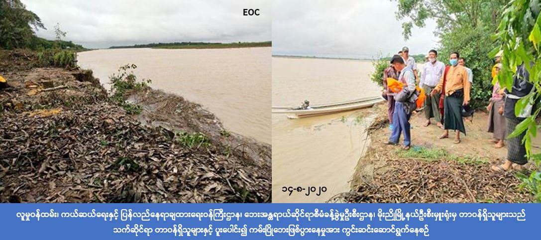လူမှုဝန်ထမ်း၊ ကယ်ဆယ်ရေးနှင့် ပြန်လည်နေရာချထားရေးဝန်ကြီးဌာန၊ ဘေးအန္တရာယ်ဆိုင်ရာစီမံခန့်ခွဲမှုဦးစီးဌာန၊ မိုးညိုမြို့နယ်ဦးစီးမှူးရုံးမှ တာဝန်ရှိသူများသည် ပဲခူးတိုင်းဒေသကြီး၊ သာယာဝတီခရိုင်၊ မိုးညိုမြို့နယ်၊ ရွှေခဲကျေးရွာ အုပ်စု၊ ရွှေခဲကျေးရွာတွင် မြစ်မခမြစ်ရေမြင့်တက်လာခြင်းကြောင့် ကမ်းပြိုဘေးဖြစ်ပွားနေမှုအခြေအနေများကို (၁၄-၈-၂၀၂၀)ရက်နေ့၌ အမျိုးသားလွှတ်တော်ကိုယ်စားလှယ်၊ မိုးညိုမြို့နယ်အထွေထွေအုပ်ချုပ်ရေးဦးစီးဌာနမှ တာဝန်ရှိသူများ၊ မြို့နယ်ရေအရင်းအမြစ်နှင့် မြစ်ချောင်းများဖွံ့ဖြိုးရေးဦးစီးဌာနမှ တာဝန်ရှိသူများ၊ မြို့နယ် လမ်းဦးစီးဌာနမှ တာဝန်ရှိသူများ၊ မြို့နယ်ဆည်မြောင်းဦးစီးဌာနမှ တာဝန်ရှိသူများ၊ ကျေးရွာအုပ်ချုပ်ရေးမှူးများ၊ ပြည်သူများနှင့်အတူ ကွင်းဆင်း လှည့်လည်ကြည့်ရှုခဲ့ကြောင်း သိရှိရပါသည်။
