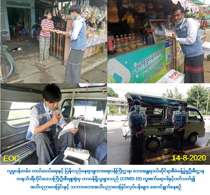 လူမှုဝန်ထမ်း၊ ကယ်ဆယ်ရေးနှင့် ပြန်လည်နေရာချထားရေးဝန်ကြီးဌာန၊ ဘေးအန္တရာယ် ဆိုင်ရာစီမံခန့်ခွဲမှုဦးစီးဌာန၊ တနင်္သာရီတိုင်းဒေသကြီးဦးစီးမှူးရုံးမှ တာဝန်ရှိသူများသည် (၁၄-၈-၂၀၂၀) ရက်နေ့တွင် ထားဝယ်မြို့နယ်အတွင်းရှိ ဇလွန်းကျေးရွာနှင့် တလိုင်းတောင်ကျေးရွာ တို့တွင် လော်စပီကာတို့ဖြင့် Covid-19 လတ်တရောဂါအသက်ရှုလမ်းကြောင်းဆိုင်ရာ ရောဂါ နှင့် ပတ်သက်၍ လိုက်နာဆောင်ရွက်ရမည့်အချက်များနှင့် မိုးရာသီကာလသို့ ရောက်ရှိလာပြီ ဖြစ်သည့်အတွက် ရေဘေး၊ မြေပြိုဘေးနှင့် မိုးကြိုးဘေးစသည့် သဘာဝဘေးအန္တရာယ်နှင့် ပတ်သက်သည့် ဆောင်ရန်/ရှောင်ရန်အချက်များအား ပြည်သူသို့အသိပညာပေး ပန်ကြား ချက်များအား လှည့်လည်ကြေညာခြင်းများဆောင်ရွက်ခဲ့ပြီး လက်ကမ်းစာစောင်များ ဝေငှခဲ့ ပါကြောင်း သတင်းရရှိပါသည်။