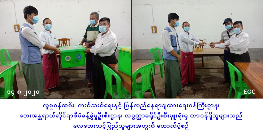 လူမှုဝန်ထမ်း၊ ကယ်ဆယ်ရေးနှင့် ပြန်လည်နေရာချထားရေးဝန်ကြီးဌာန၊ ဘေးအန္တရာယ်ဆိုင်ရာစီမံခန့်ခွဲမှုဦးစီးဌာန၊ လပွတ္တာခရိုင်ဦးစီးမှူးရုံးမှ တာဝန်ရှိသူများသည် လပွတ္တာမြို့နယ်၊ ဆင်ခြေရာကျေးရွာအုပ်စု၊ ဆင်ခြေရာကျေးရွာ၌ (၁၃-၈-၂၀၂၀) ရက်နေ့၊ (၁၈:၃၀) နာရီအချိန်တွင် ဖြစ်ပွားခဲ့သော လေဘေးကြောင့် ပြိုကျပျက်စီးခဲ့သည့် နေအိမ် (၂) လုံးနှင့် အမိုးလန်ခဲ့သည့် နေအိမ်(၂) လုံး၊ စုစုပေါင်းနေအိမ်(၄)လုံး၊ အိမ်ထောင်စု (၄) စုမှ လူဦးရေ (၁၇) ဦးအတွက် ကယ်ဆယ်ရေးပစ္စည်း (၁၇)မျိုးပါ (၂)ပုံး၊ အိမ်ဆောက်ပစ္စည်းဖိုး (၃၀၀၀၀ဝိ/-)၊ ဆန်ရိက္ခာ(၇)ရက်စာရန်ပုံငွေ (၃၅၇၀ဝိ/-) အား (၁၄-၈-၂၀၂၀) ရက်နေ့၊ (၁၆:၀၀) နာရီအချိန်တွင် ဘေးသင့်ပြည်သူများထံ သွားရောက်ထောက်ပံ့ပေးအပ်ခဲ့ကြောင်း သတင်းရရှိပါသည်။