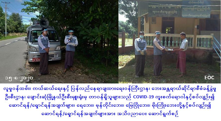 လူမှုဝန်ထမ်း၊ ကယ်ဆယ်ရေးနှင့် ပြန်လည်နေရာချထားရေးဝန်ကြီးဌာန၊ ဘေးအန္တရာယ်ဆိုင်ရာစီမံခန့်ခွဲမှုဦးစီးဌာန၊ ချောင်းဆုံမြို့နယ်ဦးစီးမှူးရုံးမှ တာဝန်ရှိသူများသည် (၁၅-၈-၂၀၂၀) ရက်နေ့တွင် ချောင်းဆုံမြို့နယ်အတွင်းရှိ ကွမ်သဲကျေးရွာနှင့် ကုလားဘီကျေးရွာတို့၌ COVID-19 ကူးစက်ရောဂါနှင့်စပ်လျဉ်း၍ ဆောင်ရန်/ရှောင်ရန်အချက်များ၊ ရေဘေး၊ မုန်တိုင်းဘေး၊ မြေပြိုဘေး၊ မိုးကြိုးဘေးတို့နှင့်စပ်လျဉ်း၍ ဆောင်ရန်/ရှောင်ရန်အချက်များကို အသံချဲ့စက်ဖြင့် အသိပညာပေးနှိုးဆော်ခဲ့ပြီး လက်ကမ်းစာစောင်များ ဝေငှပေးခဲ့ကြောင်း သတင်းရရှိပါသည်။