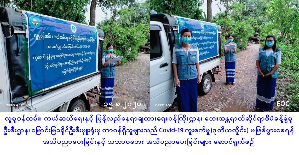 လူမှုဝန်ထမ်း၊ ကယ်ဆယ်ရေးနှင့် ပြန်လည်နေရာချထားရေးဝန်ကြီးဌာန၊ ဘေးအန္တရာယ်ဆိုင်ရာစီမံခန့်ခွဲမှုဦးစီးဌာန၊ မြောင်းမြခရိုင်ဦးစီးမှူးရုံးမှ တာဝန်ရှိသူများသည် (၁၅-၈-၂၀၂၀) ရက်နေ့၊ နံနက် (၀၉;၃၀) နာရီအချိန်မှစ၍ နေ့လည် (၁၂:၃၀) နာရီအချိန်အထိ မြောင်းမြခရိုင်၊ အိမ်မဲမြို့နယ်၊ ရွာသစ်ကျေးရွာ၊ ပဒတ်ကျေးရွာ၊ ကညင်ကုန်းကျေးရွာ၊ တကောကျေးရွာနှင့် တံခွန်တိုင်ကျေးရွာများအတွင်း လတ်တလောနိုင်ငံအသီးသီးတွင် ကူးစက်ပျံ့နှံ့လျက်ရှိသည့် Covid-19 ကူးစက်ရောဂါနှင့်စပ်လျဉ်း၍ Covid-19 ကူးစက်ရောဂါထိန်းချုပ်ရေးနှင့် အရေးပေါ်တုန့်ပြန်ရေးကော်မတီမှ (၂၉.၇.၂၀၂၀) ရက်နေ့အထိ ထုတ်ပြန်ပြီးဖြစ်သည့် တားမြစ်မိန့်နှင့် ညွှန်ကြားချက်များအားလည်းကောင်း၊ ရာသီအလိုက်ဖြစ်ပွားတက်သော သဘာဝဘေးအန္တရာယ်များနှင့် ပတ်သတ်သည့် သဘာဝဘေးအသိပညာပေးခြင်းတို့အားလည်းကောင်း အများပြည်သူများသိရှိလိုက်နာရန် အသိပညာပေးခြင်း လုပ်ငန်းများ ပြုလုပ်ဆောင်ရွက်ခဲ့ကြောင်း သတင်းရရှိပါသည်။