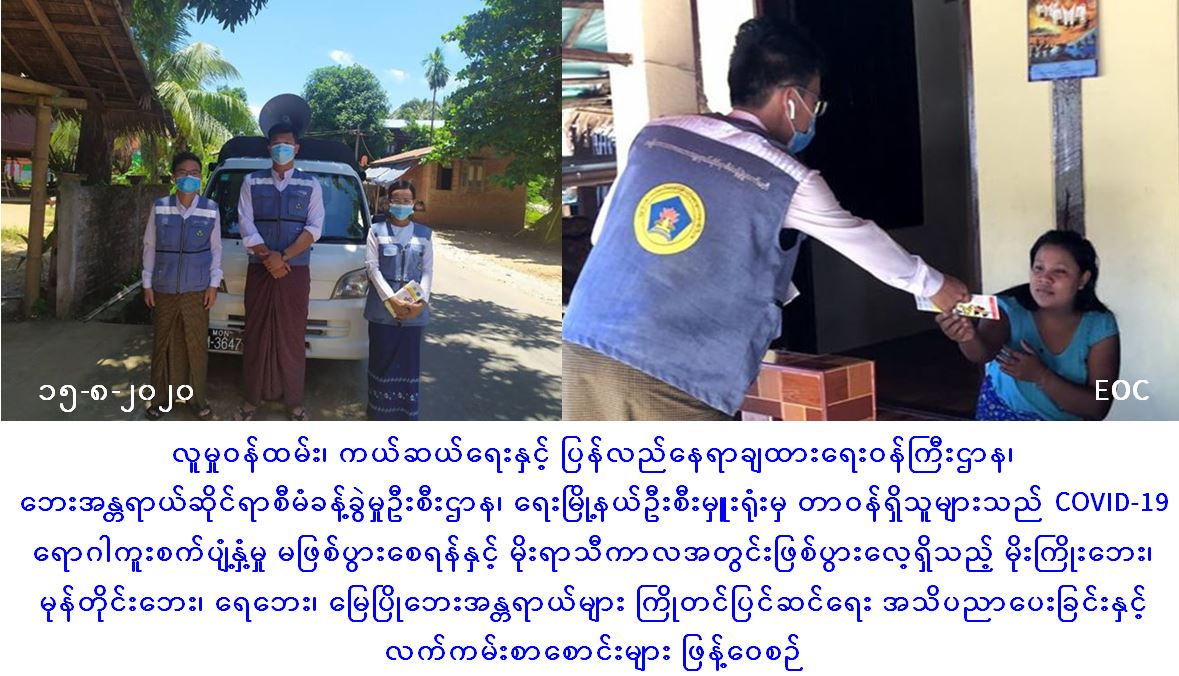 လူမှုဝန်ထမ်း၊ ကယ်ဆယ်ရေးနှင့် ပြန်လည်နေရာချထားရေးဝန်ကြီးဌာန၊ ဘေးအန္တရာယ်ဆိုင်ရာစီမံခန့်ခွဲမှုဦးစီးဌာန၊ ရေးမြို့နယ်ဦးစီးမှူးရုံးမှ တာဝန်ရှိသူများသည် (၁၅-၈-၂၀၂၀) ရက်နေ့၊ (၁၀:၀၀) နာရီအချိန်မှ (၁၄:၀၀) နာရီအချိန်အထိ မွန်ပြည်နယ်၊ မော်လမြိုင်ခရိုင်၊ ရေးမြို့နယ်၊ အံဒင်ကျေးရွာ၊ နှီးနူကျေးရွာနှင့် သာဂရံကျေးရွာတို့တွင် COVID-19 ရောဂါကူးစက်ပျံ့နှံ့မှု မဖြစ်ပွားစေရန်နှင့် မိုးရာသီကာလအတွင်းဖြစ်ပွားလေ့ရှိသည့် မိုးကြိုးဘေး၊ မုန်တိုင်းဘေး၊ ရေဘေး၊ မြေပြိုဘေးအန္တရာယ်များကြိုတင်ပြင်ဆင်ရေးအသိပညာပေးခြင်းနှင့် လက်ကမ်းစာစောင်များ ဖြန့်ဝေပေးခဲ့ခြင်းကို ဆောင်ရွက်ခဲ့ကြောင်း သတင်းရရှိပါသည်။