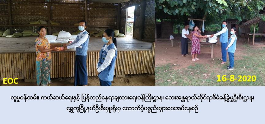 လူမှုဝန်ထမ်း၊ ကယ်ဆယ်ရေးနှင့် ပြန်လည်နေရာချထားရေးဝန်ကြီးဌာန၊ ဘေးအန္တရာယ်ဆိုင်ရာ စီမံခန့်ခွဲမှုဦးစီးဌာန၊ ရွှေကူမြို့နယ်ဦးစီးမှူးရုံးမှ တာဝန်ရှိသူများသည် (၁၆-၈-၂၀၂၀) ရက်နေ့၊ နံနက်(၁၀:၃၀)နာရီအချိန်တွင် ရွှေကူမြို့၊ နှစ်ခြင်းIDPsစခန်းရှိ အိမ်ထောင်စု(၈၄)စု၊ လူဦးရေ (၃၀၆)ဦးတို့အတွက် ထုံး(၁၀)အိတ်၊ ဆပ်ပြာ(၃၀၆)ခဲနှင့် ကက်သလစ် IDPs စခန်းရှိ အိမ် ထောင်စု(၄၂)စု၊ လူဦးရေ(၁၇၆)ဦးတို့အတွက် ထုံး(၁၀)အိတ်၊ ဆပ်ပြာ(၁၇၆)ခဲ စုစုပေါင်း ထုံး(၂၀)အိတ်၊ ဆပ်ပြာ(၄၈၂)ခဲတို့အား ထောက်ပံ့ပေးအပ်ခဲ့ကြောင်း သတင်းရရှိပါသည်။