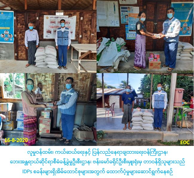 လူမှုဝန်ထမ်း၊ ကယ်ဆယ်ရေးနှင့် ပြန်လည်နေရာချထားရေးဝန်ကြီးဌာန၊ ဘေးအန္တရာယ်ဆိုင်ရာစီမံခန့်ခွဲမှုဦးစီးဌာန၊ ဗန်းမော်ခရိုင်ဦးစီးမှူးရုံးမှ တာဝန်ရှိသူများသည် ဗန်းမော်မြို့နယ်၊ လီဆူ IDPs စခန်းမှ အိမ်ထောင်စု(၁၁၃)စု လူဦးရေ(၆၄၅)ဦးအတွက် paris ဆပ်ပြာ (၆၄၅)ခဲ နှင့် ထုံးအိတ်(၁၀)အိတ်အားလည်းကောင်း၊ AD2000 IDPs စခန်းမှ အိမ်ထောင်စု(၁၆၆)စု လူဦးရေ(၇၈၇)ဦးအတွက် paris ဆပ်ပြာ (၇၈၇)ခဲ နှင့် ထုံးအိတ်(၁၀)အိတ်အားလည်းကောင်း၊ ရောဘက် စခန်းမှ အိမ်ထောင်စု (၆၂၈)စု၊ လူဦးရေ (၃၉၅၅)ဦးအတွက် ဆပ်ပြာ(၃၉၅၅)နှင့်ထုံး(၁၀)အိတ်အားလည်းကောင်း၊ ထွယ်ဆန်စခန်းမှ အိမ်ထောင်စု(၃၇)စု လူဦးရေ(၂၁၆)ဦးအတွက် paris ဆပ်ပြာ (၂၁၆)ခဲနှင့် ထုံးအိတ်(၁၀)အိတ်အား လည်းကောင်း၊ နှစ်ခြင်းမူရင်း စခန်းမှ အိမ်ထောင်စု(၁၁)စု လူဦးရေ(၅၀)ဦးအတွက် paris ဆပ်ပြာ (၅၀)ခဲ နှင့် ထုံးအိတ်(၁၀)အိတ်တို့အားလည်းကောင်း၊ ဖန်းခါးကုန်းစခန်းမှ အိမ်ထောင်စု(၆၆)စု လူဦးရေ(၃၄၆)ဦးအတွက် paris ဆပ်ပြာ (၃၄၆)ခဲ နှင့် ထုံးအိတ်(၁၀)အိတ် တို့ကို (၁၆-၈-၂၀၂၀)ရက်နေ့ နံနက်(၁၀:၀၀)နာရီအချိန်တွင်သွားရောက်ထောက်ပံ့ခဲ့ပါကြောင်း သတင်းရရှိပါသည်။