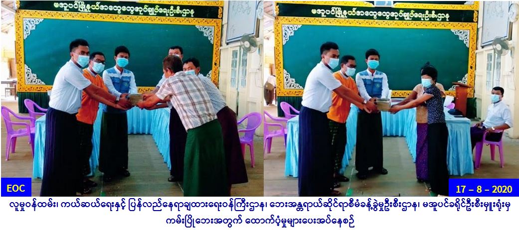 လူမှုဝန်ထမ်း၊ ကယ်ဆယ်ရေးနှင့် ပြန်လည်နေရာချထားရေး ဝန်ကြီးဌာန၊ ဘေးအန္တရာယ်ဆိုင်ရာစီမံခန့်ခွဲမှုဦးစီးဌာန၊ မအူပင် ခရိုင်ဦးစီးမှူးရုံးမှ တာဝန်ရှိသူများသည် (၁၅.၈.၂၀၂၀) ရက်နေ့တွင် မအူပင်မြို့နယ်၊ မီးသွေးချောင်းကျေးရွာအုပ်စု၊ သောင်တန်း ကျေးရွာ၌ (၁၄-၈-၂၀၂၀) ရက်နေ့တွင် ဖြစ်ပွားခဲ့သော ကမ်းပြိုဘေးကြောင့် ကြိုတင်ဖျက်သိမ်းပြောင်းရွှေ့ခဲ့သည့် နေအိမ် (၁၁)လုံး၊ အိမ်ထောင်စု (၁၁)စုမှ လူဦးရေ (၄၅)ဦးနှင့် ကျွဲဒုံးကျေးရွာအုပ်စု၊ ကျွဲသောင် ကျေးရွာ၌ ဖြစ်ပွားခဲ့သော ကမ်းပြိုဘေး ကြောင့် ကြိုတင်ဖျက်သိမ်း ပြောင်းရွှေ့ နေအိမ်(၁)လုံး၊ အိမ်ထောင်စု(၁)စုမှ လူဦးရေ (၃)ဦး စုစုပေါင်း နေအိမ် (၁၂)လုံး၊ အိမ်ထောင်စု (၁၂)စုမှ လူဦးရေ (၄၈)ဦးအတွက် ဆန်ရိက္ခာ၇ရက်စာ (၁၀၀၈၀၀/-)ကျပ်၊ အိမ်ဆောက်ပစ္စည်းဖိုးရန်ပုံငွေ (၁၂၀၀၀၀၀/-) ကျပ်၊ စုစုပေါင်းရန်ပုံငွေ (၁၃၀၀၈၀၀/-) ကျပ်အား (၁၇.၈.၂၀၂၀) ရက်နေ့ (၁၀:၅၀) နာရီအချိန်တွင် တိုင်းဒေသကြီးလွှတ်တော်ကိုယ်စားလှယ်၊ အထွေထွေအုပ်ချုပ်ရေးဦးစီးဌာနမှ တာဝန်ရှိသူများနှင့်အတူ ကျေးရွာအုပ်ချုပ်ရေးမှူး၊ ရပ်မိရပ်ဖများရှေ့မှောက်၌ ကမ်းပြိုဘေးသင့်ပြည်သူများ လက်ဝယ်အရောက် ထောက်ပံ့ပေးအပ်ခဲ့ပါကြောင်း သတင်းရရှိပါသည်။