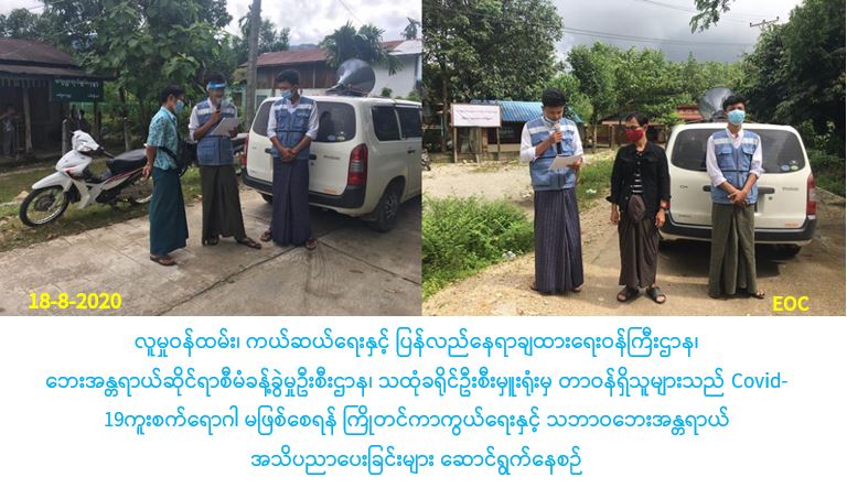 လူမှုဝန်ထမ်း၊ ကယ်ဆယ်ရေးနှင့် ပြန်လည်နေရာချထားရေးဝန်ကြီးဌာန၊ ဘေးအန္တရာယ်ဆိုင်ရာစီမံခန့်ခွဲမှုဦးစီးဌာန၊ သထုံခရိုင်ဦးစီးမှူးရုံးမှ တာဝန်ရှိသူများသည် (၁၈-၈-၂၀၂၀) ရက်နေ့ (၁၀:၀၀) နာရီအချိန်မှ (၁၄:၃၀) နာရီအချိန်ထိ မွန်ပြည်နယ်၊ သထုံခရိုင်၊ ပေါင်မြို့နယ်၊ ဆင်ရွာကျေးရွာနှင့်အီဗြစ်ကျေးရွာတို့တွင် Covid-19 ရောဂါကူးစက်ပျံ့နှံ့မှုများမဖြစ်ပွားစေရေးနှင့် မိုးရာသီကာလအတွင်းဖြစ်ပွားလေ့ရှိသည့် မိုးကြိုးဘေး၊ မုန်တိုင်းဘေး၊ ရေဘေးနှင့် မြေပြိုဘေးအန္တရာယ်များ ကြိုတင် ပြင်ဆင်ရေး အသိပညာပေးဟောပြောခြင်းအား အသံချဲ့စက်များဖြင့်လည်းကောင်း၊ ရေဘေးအန္တရာယ် ကြိုတင်ကာကွယ်ရေး ပြည်သူသို့ အသိပေးနှိုးဆော်ခြင်းအား Handspeaker များဖြင့်လည်းကောင်း အသိပေးနှိုးဆော်ကြေငြာခဲ့ပါကြောင်း သတင်းရရှိပါသည်။