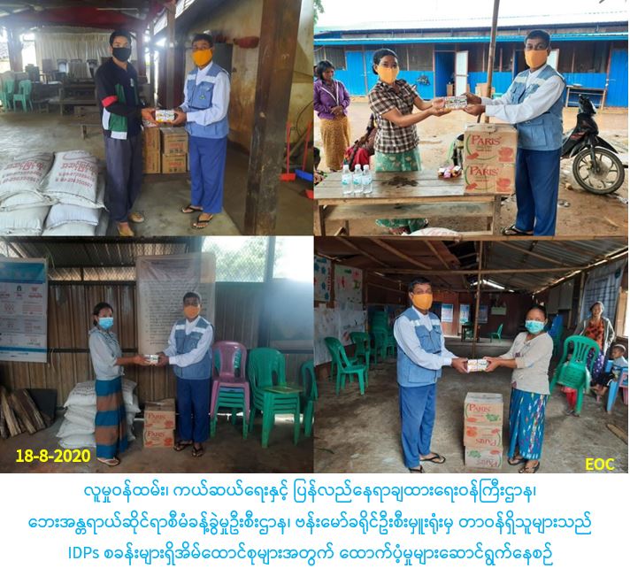 လူမှုဝန်ထမ်း၊ ကယ်ဆယ်ရေးနှင့် ပြန်လည်နေရာချထားရေးဝန်ကြီးဌာန၊ ဘေးအန္တရာယ်ဆိုင်ရာစီမံခန့်ခွဲမှုဦးစီးဌာန၊ ဗန်းမော်ခရိုင်ဦးစီးမှူးရုံးမှ တာဝန်ရှိသူများသည် မိုးမောက်မြို့နယ်၊ လွယ်ဂျယ်မြို့၊ လီဆူဘုရားကျောင်း IDPs စခန်းမှ အိမ်ထောင်စု(၂၁၁)စု လူဦးရေ(၁၂၁၅)ဦးအတွက် paris ဆပ်ပြာ (၁၂၁၅)ခဲ နှင့် ထုံးအိတ်(၁၀)အိတ်ကိုလည်းကောင်း၊ နှစ်ခြင်းဘုရားကျောင်း IDPs စခန်းမှ အိမ်ထောင်စု(၃၈)စု လူဦးရေ(၂၄၁)ဦးအတွက် paris ဆပ်ပြာ (၂၄၁)ခဲ နှင့် ထုံးအိတ်(၁၀) အိတ်ကိုလည်းကောင်း၊ ကက်သလစ်IDPs စခန်းမှ အိမ်ထောင်စု (၆၇)စု၊ လူဦးရေ (၄၁၈)ဦးတို့အတွက် ဆပ်ပြာ(၄၁၈)နှင့် ထုံး(၁၀)အိတ်ကိုလည်းကောင်း၊ ဆိုင်းဂျာဘုရားကျောင်း IDPsစခန်းမှ အိမ်ထောင်စု(၄၄)စု လူဦးရေ(၂၇၄)ဦးအတွက် paris ဆပ်ပြာ (၂၇၄)ခဲ နှင့် ထုံးအိတ်(၁၀)အိတ်ကိုလည်းကောင်း၊ ညောင်နှစ်ပင်IDPs စခန်းမှ အိမ်ထောင်စု(၄၈)စု လူဦးရေ(၂၉၃)ဦး အတွက် paris ဆပ်ပြာ (၂၉၃)ခဲ နှင့် ထုံးအိတ်(၁၀)အိတ်တို့နှင့် ထန်းညIDPsစခန်းမှ အိမ်ထောင်စု(၂၄)စု လူဦးရေ(၁၁၈) ဦးအတွက် paris ဆပ်ပြာ(၁၁၈)ခဲနှင့် ထုံးအိတ်(၁၀)အိတ်တို့အား ဗန်းမော်ခရိုင်ဦးစီးမှူးရုံးမှတာဝန်ရှိသူများက(၁၈-၈-၂၀၂၀) ရက်နေ့ နံနက်(၁၀:၀၀)နာရီအချိန်တွင်သွားရောက်ထောက်ပံ့ခဲ့ပါကြောင်း သတင်းရရှိပါသည်။