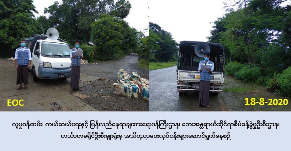 လူမှုဝန်ထမ်း၊ ကယ်ဆယ်ရေးနှင့် ပြန်လည်နေရာချထားရေးဝန်ကြီးဌာန၊ ဘေးအန္တရာယ်ဆိုင်ရာ စီမံခန့်ခွဲမှုဦးစီးဌာန၊ ဟင်္သာတခရိုင်ဦးစီးမှူးရုံးမှ တာဝန်ရှိသူများသည် (၁၈-၈-၂၀၂၀) ရက်နေ့ တွင် လေးမျက်နှာမြို့နယ်၊ ကြိုးကြာကွင်းအုပ်စု၊ ကြိုးကြာကွင်း၊ ကြို့ကုန်း၊ ကုန်းကလေး (ခ)ပန်းတင်ကုန်း၊ ကျွဲစားအင်း ကျေးရွာတို့၌ နံနက် (၀၈:၃၀)နာရီအချိန်မှ (၁၂:၀၀)နာရီအချိန်ထိ ကျန်းမာရေးနှင့်အားကစားဝန်ကြီးဌာနမှ ထုတ်ပြန်ထားသော Covid-19 ကူးစက်မှု ဒုတိယလှိုင်းမဖြစ်စေရန် အသိပညာပေးခြင်းလုပ်ငန်းများနှင့် ဧရာဝတီတိုင်းဒေသကြီး Covid -19 ထိန်းချုပ်ရေးနှင့် အရေးပေါ်တုံ့ပြန်ရေးကော်မတီမှ (၁၄-၇-၂၀၂၀)ရက်နေ့အထိ ထုတ်ပြန်ပြီးဖြစ်သည့် တားမြစ်မိန့်နှင့် ညွန်ကြားချက်အားလည်းကောင်း၊ ရာသီအလိုက် ဖြစ်ပွားတတ်သော သဘာဝဘေးများအန္တရာယ်များနှင့်ပတ်သက်သည့် သဘာဝဘေးအသိ ပညာပေးခြင်းတို့အားလည်းကောင်း အများပြည်သူများသိရှိလိုက်နာရန် ကွင်းဆင်းလှည့်လှည်၍ အသိပညာပေးလုပ်ငန်းများပြုလုပ်ဆောင်ရွက်ခဲ့ကြောင်း သတင်းရရှိပါသည်။