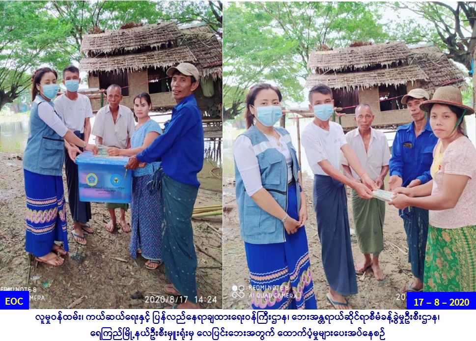 လူမှုဝန်ထမ်း၊ ကယ်ဆယ်ရေးနှင့်ပြန်လည်နေရာချထားရေး ဝန်ကြီးဌာန၊ ဘေးအန္တရာယ်ဆိုင်ရာစီမံခန့်ခွဲမှုဦးစီးဌာန၊ ရေကြည် မြို့နယ်ဦးစီးမှူးရုံးမှ တာဝန်ရှိသူများသည် (၁၄-၈-၂၀၂၀) ရက်နေ့တွင် ရေကြည်မြို့နယ်၊ ညောင်ပင်သာယာကျေးရွာအုပ်စု၊ မကျီးငူကျေးရွာတွင် လေပြင်းတိုက်ခတ်မှုကြောင့် ပြိုကျ/ပျက်စီးနေအိမ် (၁)လုံးအတွက် အိမ်ဆောက်ပစ္စည်းဖိုးရန်ပုံငွေ (၁၀၀၀၀ဝ/-)ကျပ်၊ အမိုးလန်ပျက်စီးနေအိမ်(၂)လုံးအတွက် အိမ်ဆောက်ပစ္စည်းဖိုးရန်ပုံငွေ (၈၀၀၀ဝ/-)ကျပ်၊ စုစုပေါင်းလူဦးရေ (၁၂)ဦးအတွက် (၇)ရက်စာရန်ပုံငွေ (၂၅၂၀ဝ/-)ကျပ်၊ စုစုပေါင်းကယ်ဆယ်ရေးရန်ပုံငွေ (၂၀၅၂၀ဝ/-)ကျပ်နှင့် ကယ်ဆယ်ရေး ပစ္စည်း(၁၇)မျိုးပါ(၁)အိမ်ထောင်စာ(၃၄၇၅၃/-)ကျပ်အား (၁၇-၈-၂၀၂၀)ရက်နေ့ (၁၅:၃၀)နာရီအချိန်၌ ဘေးသင့်ပြည်သူများ လက်ဝယ်အရောက် ထောက်ပံ့ပေးအပ်ခဲ့ပါကြောင်း သတင်းရရှိပါသည်။