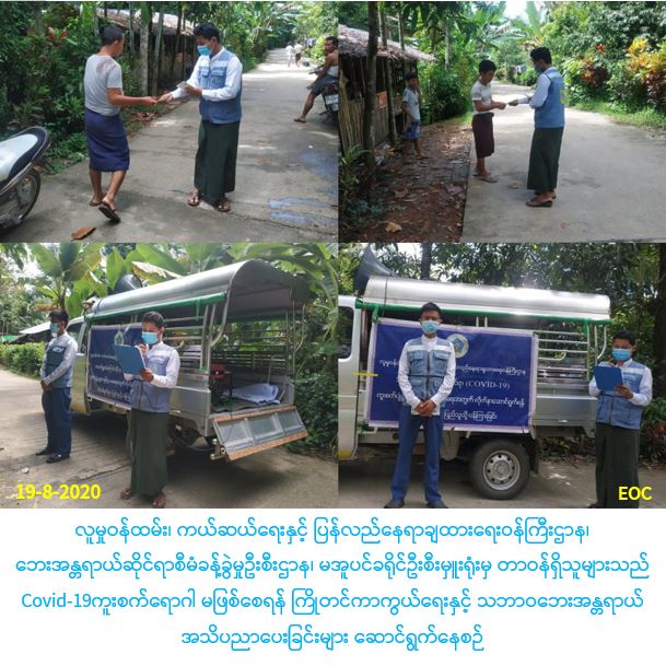 လူမှုဝန်ထမ်း၊ ကယ်ဆယ်ရေးနှင့် ပြန်လည်နေရာချထားရေးဝန်ကြီးဌာန၊ ဘေးအန္တရာယ်ဆိုင်ရာစီမံခန့်ခွဲမှုဦးစီးဌာန၊ မအူပင်ခရိုင်ဦးစီးမှူးရုံးမှ တာဝန်ရှိသူများသည် (၁၉-၈-၂၀၂၀)ရက်နေ့တွင် မအူပင်မြို့နယ်၊ ခနောင်ထော်ကျေးရွာအုပ်စုရှိ ခနောင်ထော်ကျေးရွာ၊ မရမ်းကျေးရွာနှင့် ပန်တပွတ်ကျေးရွာတို့၌ COVID-19 ရောဂါကူးစက်ပျံ့နှံ့မှု ဒုတိယလှိုင်း မဖြစ်ပွားစေရန် အများပြည်သူအလွယ်တကူ သိရှိလိုက်နာဆောင်ရွက်ရန်အချက်များနှင့် မိုးရာသီတွင် ဖြစ်ပွားလေ့ရှိသည့် သဘာဝဘေး အန္တရာယ်များကြိုတင်ပြင်ဆင်ရေး အသိပေးချက်များကို လှည်လည်ဟောပြောခြင်း၊ ဘေး (၈) မျိုးလက်ကမ်းစာစောင်များ ဝေငှခြင်းများ ဆောင်ရွက်ခဲ့ပါကြောင်း သတင်းရရှိပါသည်။