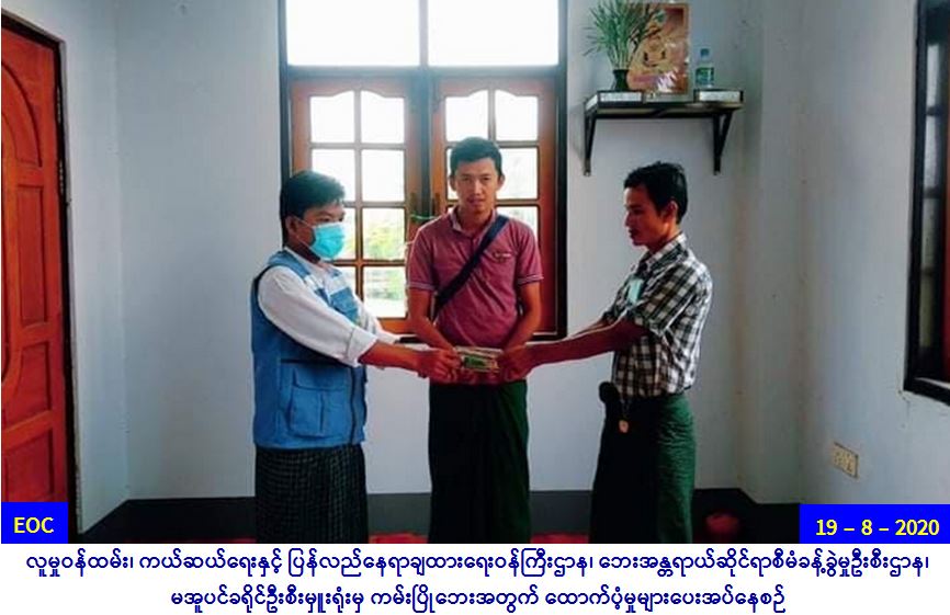 လူမှုဝန်ထမ်း၊ ကယ်ဆယ်ရေးနှင့်ပြန်လည်နေရာချထားရေး ဝန်ကြီးဌာန၊ ဘေးအန္တရာယ်ဆိုင်ရာစီမံခန့်ခွဲမှုဦးစီးဌာန၊ မအူပင် ခရိုင်ဦးစီးမှူးရုံးမှ တာဝန်ရှိသူများသည် (၁၈-၈-၂၀၂၀)ရက်နေ့တွင် မအူပင်မြို့နယ်၊ ကျွဲဒုံးကျေးရွာအုပ်စု၊ ကျွဲသောင်ကျေးရွာ၌ ဖြစ်ပွားခဲ့သော ကမ်းပြိုဘေးကြောင့် ကြိုတင်ဖျက်သိမ်းပြောင်းရွှေ့ခဲ့ သည့် နေအိမ် (၁)လုံး၊ အိမ်ထောင်စု (၁)စုမှ လူဦးရေ (၂)ဦး အတွက် ဆန်ရိက္ခာ(၇)ရက်စာ (၄၂၀၀/-)၊ အိမ်ဆောက်ပစ္စည်းဖိုးရန်ပုံငွေ (၁၀၀၀၀၀/-)ကျပ်၊ စုစုပေါင်းရန်ပုံငွေ (၁၀၄၂၀၀/-) ကျပ်အား (၁၉.၈.၂၀၂၀) ရက်နေ့ (၁၁:၀၀) နာရီအချိန်တွင် ကျေးရွာအုပ်ချုပ်ရေးမှူး၊ ရပ်မိရပ်ဖများရှေ့မှောက်၌ ကမ်းပြို ဘေးသင့်ပြည်သူများ လက်ဝယ်အရောက် ထောက်ပံ့ပေးအပ်ခဲ့ပါကြောင်း သတင်းရရှိပါသည်။