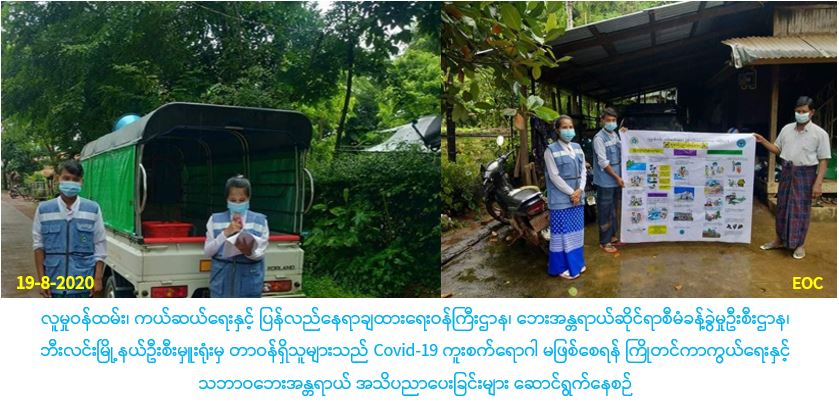 လူမှုဝန်ထမ်း၊ ကယ်ဆယ်ရေးနှင့် ပြန်လည်နေရာချထားရေးဝန်ကြီးဌာန၊ ဘေးအန္တရာယ်ဆိုင်ရာစီမံခန့်ခွဲမှုဦးစီးဌာန၊ ဘီးလင်းမြို့နယ်ဦးစီးမှူးရုံးမှ တာဝန်ရှိသူများသည် (၁၉-၉-၂၀၂၀) ရက်နေ့၊ (၀၉:၀၀) နာရီအချိန်မှ (၁၂:၃၀) နာရီအချိန်ထိ မွန်ပြည်နယ်၊ သထုံခရိုင်၊ ဘီးလင်းမြို့နယ်၊ ဝင်းကကျေးရွာအုပ်စုအတွင်းရှိ ဝင်းကကျေးရွာ၊ ကျောက်လုံးကြီး(မြောက်ပိုင်း)ကျေးရွာ၊ ကျောက်လုံးကြီး(တောင်ပိုင်း)ကျေးရွာ၊ ကျောက်လုံးကြီး(အလယ်ပိုင်း)ကျေးရွာနှင့် ကျောက်လုံးကြီးကျေးရွာ တို့တွင် Covid-19 ရောဂါကူးစက်ပျံ့နှံ့မှုများမဖြစ်ပွားစေရေးနှင့် မိုးရာသီကာလအတွင်း ဖြစ်ပွားလေ့ရှိသည့် မိုးကြိုးဘေး၊ မုန်တိုင်းဘေး၊ ရေဘေးနှင့် မြေပြိုဘေးအန္တရာယ်များ ကြိုတင်ပြင်ဆင်ရေး အသိပညာပေးခြင်းနှင့် ဗီနိုင်းပိုစတာများဖြန့်ဝေပေးခဲ့ပါကြောင်း သတင်းရရှိပါသည်။