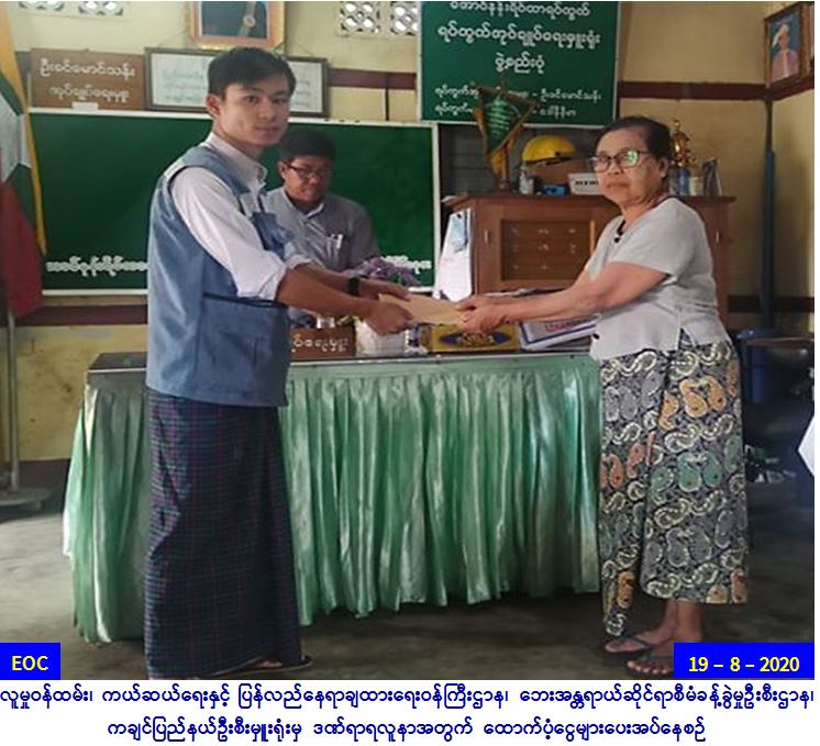 လူမှုဝန်ထမ်း၊ ကယ်ဆယ်ရေးနှင့်ပြန်လည်နေရာချထားရေး ဝန်ကြီးဌာန၊ ဘေးအန္တရာယ်ဆိုင်ရာစီမံခန့်ခွဲမှုဦးစီးဌာန၊ ကချင် ပြည်နယ်ဦးစီးမှူးရုံးမှ တာဝန်ရှိသူများသည် (၁၅-၈-၂၀၂၀) ရက်နေ့ (၀၇:၁၄)နာရီအချိန်တွင် မြစ်ကြီးနားခရိုင်၊ မြစ်ကြီးနားမြို့၊ အောင်နန်းရပ်ကွက်၊ မီးရထားရဲစခန်းရှေ့၌ မိုးသည်းထန်စွာရွာ သွန်းမှုကြောင့် ညောင်ပင်လဲကျကာ ဒဏ်ရာရရှိသူ(၂)ဦးအတွက် (၁)ဦးလျှင် (၅၀၀၀ဝ/-)ကျပ်နှုန်းဖြင့် (၁၀၀၀၀ဝ/-)ကျပ်အား (၁၉-၈-၂၀၂၀)နေ့ (၁၅:၀၀)နာရီအချိန်၌ အောင်နန်းရပ်ကွက် အုပ်ချုပ်ရေးမှူးရုံးတွင် ပြည်သူများလက်ဝယ်အရောက် ထောက်ပံ့ပေးအပ်ခဲ့ပါကြောင်း သတင်းရရှိပါသည်။