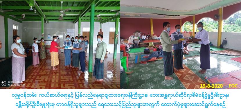 လူမှုဝန်ထမ်း၊ ကယ်ဆယ်ရေးနှင့် ပြန်လည်နေရာချထားရေးဝန်ကြီးဌာန၊ ဘေးအန္တရာယ်ဆိုင်ရာစီမံခန့်ခွဲမှုဦးစီးဌာန၊ ခန္တီးခရိုင်ဦးစီးမှူးရုံးမှ တာဝန်ရှိသူများသည် (၁၈-၈-၂၀၂၀)ရက်နေ့တွင် ခန္တီးမြို့နယ်၊ မြို့မရပ်ကွက်နှင့် ပေါမိုင်းရပ်ကွက်၌ မိုးသည်းထန်စွာရွာသွန်းမှုကြောင့် ချင်းတွင်းမြစ်ကမ်းဘေး၀ဲယာနှင့် မြေနိမ့်ပိုင်းနေရာများသို့ ရေ၀င်ရောက်ခဲ့ရာပြောင်းရွှေ့ရသည့် စုစုပေါင်းအိမ်ထောင်စု (၅၆) စု၊ လူဦးရေ (၂၆၂) ဦးတို့အတွက် ဆန်ရိက္ခာဖိုးထောက်ပံ့ငွေ (၅၅၀၂၀ဝ/-)ကျပ်၊ ဆပ်ပြာ(၅၆) တောင့်နှင့် နှာခေါင်းစည်း(၂၆၂)ခုတို့အား (၁၉-၈-၂၀၂၀) ရက်နေ့၊ (၁၃:၂၃) နာရီနှင့်(၁၃း၅၈)နာရီအချိန်တို့တွင် မြို့နယ်အုပ်ချုပ်ရေးမှူးနှင့် မြို့နယ်အဆင့်ဌာနဆိုင်ရာအကြီးအကဲများဖြင့် ဘေးသင့်ပြည်သူများအား ထောက်ပံ့ခဲ့ပါကြောင်း သတင်းရရှိပါသည်။