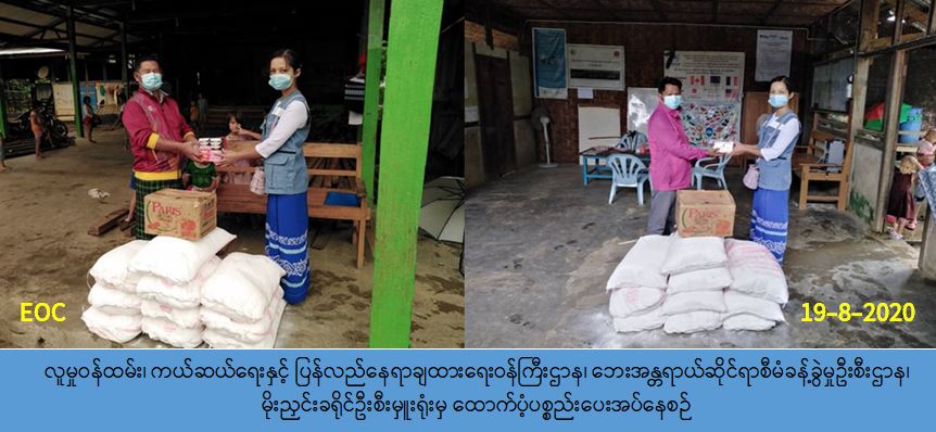 လူမှုဝန်ထမ်း၊ ကယ်ဆယ်ရေးနှင့်ပြန်လည်နေရာချထားရေးဝန်ကြီးဌာန၊ ဘေးအန္တရာယ်ဆိုင်ရာ စီမံခန့်ခွဲမှုဦးစီးဌာန၊ မိုးညှင်းခရိုင်ဦးစီးမှူးရုံးမှ တာဝန်ရှိသူများသည် (၁၉-၈-၂၀၂၀) ရက်နေ့တွင် မိုးကောင်းမြို့ ကျွန်းတောရပ်ကွက် IDPနှစ်ခြင်းဘုရားကျောင်း၊ နောင်ကိုင်တော်မဟောင်IDP စခန်းနှင့် နတ်ကြီးကုန်းIDPစခန်း(၃) ခုမှ အိမ်ထောင်စု(၃၈) စု၊ လူဦးရေ (၁၉၃) ဦးအတွက် ဆပ်ပြာ(၁၉၃) ခဲနှင့် ထုံး(၃၀) အိတ်တို့အားသွားရောက်ထောက်ပံပေးအပ်ခဲ့ပါကြောင်း သတင်း ရရှိပါသည်။