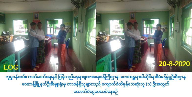 လူမှုဝန်ထမ်း၊ ကယ်ဆယ်ရေးနှင့် ပြန်လည်နေရာချထားရေးဝန်ကြီးဌာန၊ ဘေးအန္တရာယ် ဆိုင်ရာစီမံခန့်ခွဲမှုဦးစီးဌာန၊ ဖားကန့်မြို့နယ်ဦးမှူးရုံး တာဝန်ရှိသူများသည် ဖားကန့်မြို့နယ်၊ မော်ဝမ်းရပ်ကွက်၊ မော်မောင်းကုန်းအပိုင်း KNDPC လုပ်ကွက်အတွင်းတွင် (၁၈-၈-၂၀၂၀) ရက်နေ့၊ (၀၇:ဝဝ)နာရီအချိန်၌ ဖြစ်ပွားခဲ့သော အထက်ကမ်းပါးယံမှ မြေစာလျောကျမှု ကြောင့် ရေမဆေးကျောက်ရှာဖွေသူ(၁)ဦး ကျောက်ခဲထိမှန်သေဆုံးသည့်အတွက် ထောက်ပံ့ ငွေ (၃၀၀,၀၀ဝိ/-) ကျပ်အား (၂၀-၈-၂၀၂၀)ရက်နေ့၊ (၁၀:ဝဝ)နာရီအချိန်တွင် ဘေးသင့် ပြည်သူထံ လက်ဝယ်အရောက် သွားရောက်ထောက်ပံ့ပေးခဲ့ကြောင်း သတင်းရရှိပါသည်။