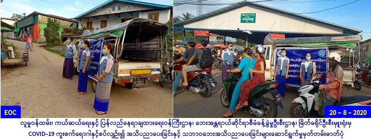 လူမှုဝန်ထမ်း၊ ကယ်ဆယ်ရေးနှင့် ပြန်လည်နေရာချထားရေး ဝန်ကြီးဌာန၊ ဘေးအန္တရာယ်ဆိုင်ရာစီမံခန့်ခွဲမှုဦးစီးဌာန၊ မြိတ်ခရိုင် ဦးစီးမှူးရုံးမှ တာဝန်ရှိသူများသည် (၂၀.၈.၂၀၂၀)ရက်နေ့ နံနက် (၀၆:၀၀)နာရီမှစ၍တွင် မြိတ်ဂဝေသီစေတနာရှင် လူမှုကူညီ ရေးအသင်း ပရဟိတအဖွဲ့တို့နှင့်ပူးပေါင်း၍ ကုန်စိမ်းဈး၊ တောရကျောင်းဈေး၊ စစ်တပ်ဈေး၊ တင်ပြင်ဈေး၊ ပါရမီဈေး၊ မြို့သစ်ဈေး တို့တွင် COVID 19 အသက်ရှူလမ်းကြောင်းဆိုင်ရာ ရောဂါနှင့် ပတ်သက်၍ အများပြည်သူသိရှိလိုက်နာနိုင်ရန် ကျန်းမာရေးနှင့် အားကစားဝန်ကြီးဌာနက ထုတ်ပြန်ထားသော အသိပေးကြေငြာချက်များနှင့် မိုးကြိုးဘေး၊ ရေဘေး၊ လေပြင်းဘေးနှင့် စပ်လျဉ်း၍ ဌာနမှ ထုတ်ပြန်ထားသည့် လက်ကမ်းစာစောင်ပါ အချက်အလက်များ သဘာဝဘေးအသိပညာပေးခြင်းအား ဆောင်ရွက်ပြီး သဘာဝဘေးလက်ကမ်းစာစောင်များဝေငှခဲ့ပါကြောင်း သတင်းရရှိပါသည်။