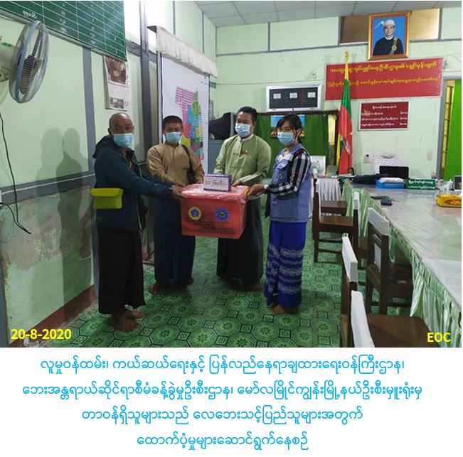 လူမှုဝန်ထမ်း၊ ကယ်ဆယ်ရေးနှင့် ပြန်လည်နေရာချထားရေးဝန်ကြီးဌာန၊ ဘေးအန္တရာယ်ဆိုင်ရာစီမံခန့်ခွဲမှုဦးစီးဌာန၊ မော်လမြိုင်ကျွန်းမြို့နယ်ဦးစီးမှူးရုံးမှ တာဝန်ရှိသူများသည် (၁၉-၈-၂၀၂၀)ရက်နေ့တွင် လပွတ္တာခရိုင်၊ မော်လမြိုင်ကျွန်းမြို့နယ်၊ ဝါးနက်ချောင်းကျေးရွာအုပ်စု၊ တံခွန်တိုင်လေးကျေးရွာ၌ ဖြစ်ပွားခဲ့သော မိုးသည်းထန်စွာရွာသွန်းပြီး လေပြင်းတိုက်ခတ်မှုကြောင့် ပြိုကျပျက်စီးခဲ့သော နေအိမ်(၁)လုံး၊ အိမ်ထောင်စု(၁)စုမှ ဘေးသင့်လူဦးရေ (၆)ဦးအတွက် ကယ်ဆယ်ရေးပစ္စည်း (၁၆)မျိုးပါ (၁)ပုံး၊ အိမ်ဆောက်ပစ္စည်းဖိုးထောက်ပံ့ငွေ (၁၀၀၀၀၀/-)ကျပ်၊ ဆန်ရိက္ခာ(၇)ရက်စာဖိုးထောက်ပံ့ငွေ (၁၂၆၀၀/-)ကျပ်၊ စုစုပေါင်း ထောက်ပံ့ငွေ (၁၁၂၆၀၀/-)ကျပ်တိတိအား (၂၀-၈-၂၀၂၀)ရက်နေ့၊ (၁၄း၃၀) နာရီအချိန်တွင် မော်လမြိုင်ကျွန်းမြို့နယ် အထွေထွေအုပ်ချုပ်ရေးဦးစီးဌာန၌ မြို့နယ်အုပ်ချုပ်ရေးမှူး၊ ကျေးရွာအုပ်ချုပ်ရေးမှူး၊ ရပ်ကျေးစာရေးတို့နှင့်အတူ ဘေးသင့်ပြည်သူများထံ ထောက်ပံ့ပေးအပ်ခဲ့ပါကြောင်း သတင်းရရှိပါသည်။