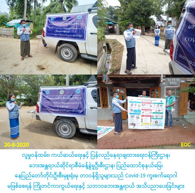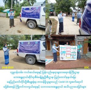 လူမှုဝန်ထမ်း၊ ကယ်ဆယ်ရေးနှင့် ပြန်လည်နေရာချထားရေးဝန်ကြီးဌာန၊ ဘေးအန္တရာယ်ဆိုင်ရာစီမံခန့်ခွဲမှုဦးစီးဌာန၊ ပြည်ထောင်စုနယ်မြေ၊ နေပြည်တော်တိုင်းဦးစီးမှူးရုံးမှ တာဝန်ရှိသူများသည် (၂၀-၈-၂၀၂၀) ရက်နေ့၊ (၀၉း၃၀) အချိန်မှ (၁၅:၃၀) အချိန်အထိ ဒက္ခိဏသီရိမြို့နယ်၊ ကြာပင်ကျေးရွာအုပ်စု၊ အောင်သုခကျေးရွာ၊ ထန်းတပင်ကျေးရွာ၊ ကျွန်းတပဲ့ကျေးရွာအုပ်စု၊ ညောင်ကုန်းကျေးရွာနှင့် ဆည်စုကျေးရွာများအတွင်းရှိ ပြည်သူများအား COVID-19 ရောဂါကူးစက်ပြန့်နှံ့မှုများ မဖြစ်ပွားစေရေး အတွက် သိရှိလိုက်နာဆောင်ရွက်ရမည့် အချက်များနှင့် မိုးရာသီကာလအတွင်း ဖြစ်ပွားတတ်သည့် ရေဘေးအန္တရာယ်နှင့် မိုးကြိုးဘေးအန္တရာယ်ဆိုင်ရာ ဆောင်ရန်/ ရှောင်ရန်အချက်များနှင့်ပတ်သက်၍ အသိပညာပေးခြင်း၊ လက်ကမ်းစာစောင်များနှင့် ဗီနိုင်းပိုစတာများဖြန့်ဝေပေးခဲ့ပါကြောင်း သတင်းရရှိပါသည်။