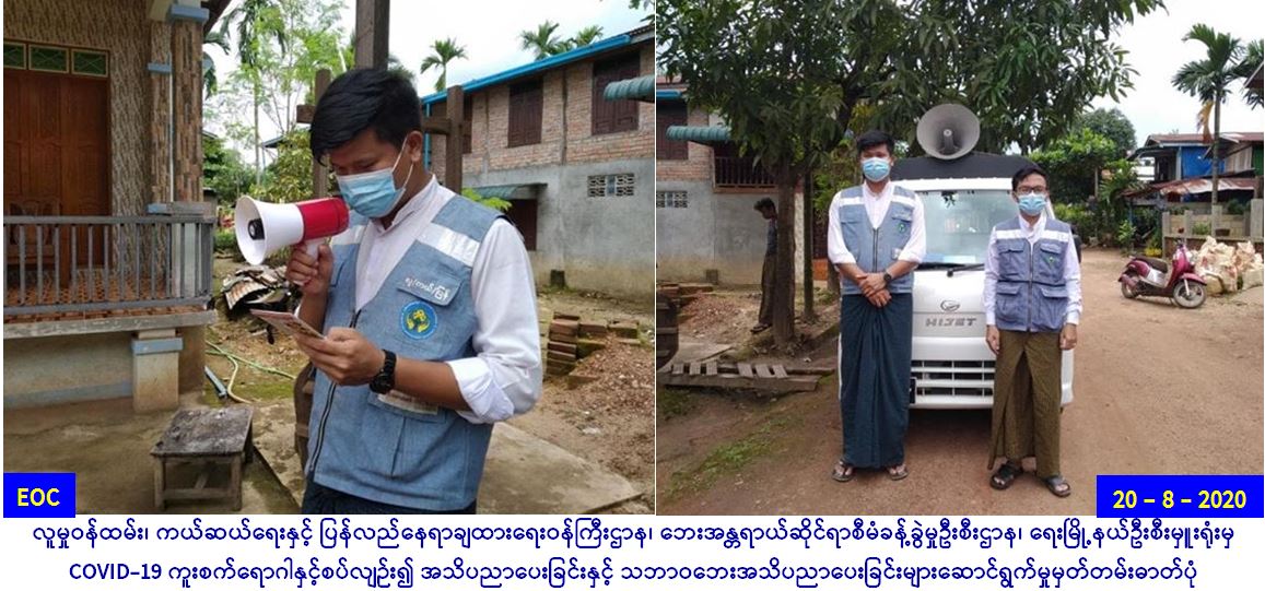 လူမှုဝန်ထမ်း၊ ကယ်ဆယ်ရေးနှင့် ပြန်လည်နေရာချထားရေး ဝန်ကြီးဌာန၊ ဘေးအန္တရာယ်ဆိုင်ရာစီမံခန့်ခွဲမှုဦးစီးဌာန၊ ရေးမြို့နယ် ဦးစီးမှူးရုံးမှ တာဝန်ရှိသူများသည် (၂၀-၈-၂၀၂၀) ရက်နေ့ (၁၀:၀၀) နာရီအချိန်မှ (၁၄:၀၀) နာရီအချိန်အထိ မွန်ပြည်နယ်၊ မော်လမြိုင်ခရိုင်၊ ရေးမြို့နယ်၊ စုံနံ့သာကျေးရွာ၊ တောင်စွန်းကျေးရွာနှင့် မှိန်စိန်ကျေးရွာတို့တွင် COVID-19 ရောဂါကူးစက်ပြန့်နှံ့မှု မဖြစ်ပွားစေရေးနှင့် မိုးရာသီကာလအတွင်းဖြစ်ပွားလေ့ရှိသည့် မိုးကြိုးဘေး၊ မုန်တိုင်းဘေး၊ ရေဘေး၊ မြေပြိုဘေးအန္တရာယ်များ ကြိုတင်ပြင်ဆင်ရေးအသိပညာပေးခြင်းနှင့် လက်ကမ်းစာစောင်များ ဖြန့်ဝေပေးခဲ့ခြင်းများအား ဆောင်ရွက်ခဲ့ပါကြောင်း သတင်း ရရှိပါသည်။