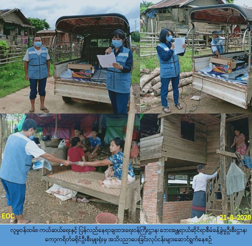 လူမှုဝန်ထမ်း၊ ကယ်ဆယ်ရေးနှင့်ပြန်လည်နေရာချထားရေးဝန်ကြီးဌာန၊ ဘေးအန္တရာယ်ဆိုင်ရာ စီမံခန့်ခွဲမှုဦးစီးဌာန၊ ကော့ကရိတ်ခရိုင်ဦးစီးမှူးရုံးမှ တာဝန်ရှိသူများသည် (၂၁-၈-၂၀၂၀) ရက်နေ့၊ နံနက်(၀၈:၀၀) နာရီအချိန်မှ နေ့လည်(၁၂:၀၀) နာရီအချိန်ထိ ကော့ကရိတ်မြို့နယ်၊ မိကလုံ ကျေးရွာအုပ်စုအတွင်းရှိ မိကလုံကျေးရွာ၊ ကျိုက်ဇင်းကျေးရွာနှင့် သမ္မံချောင်းကျေးရွာတို့၌ COVID-19 ကူးစက်မြန်ရောဂါပြန့်ပွားမှုများ မဖြစ်ပွားစေရန်အတွက် သိရှိလိုက်နာရမည့် အချက် များနှင့် မိုးရာသီကာလအတွင်း ဖြစ်ပွားတက်သော သဘာဝဘေးအန္တရာယ်များနှင့် စပ်လျဉ်း၍ ဆောင်ရန်/ရှောင်ရန် အချက်များအား အသံချဲ့စက်ဖြင့် ပြည်သူလူထုအတွင်း အသိပညာပေး ဆောင်ရွက်ခဲ့ပြီး လက်ကမ်းစာစောင်များ ဖြန့်ဝေပေးခဲ့ပါကြောင်း သတင်းရရှိပါသည်။