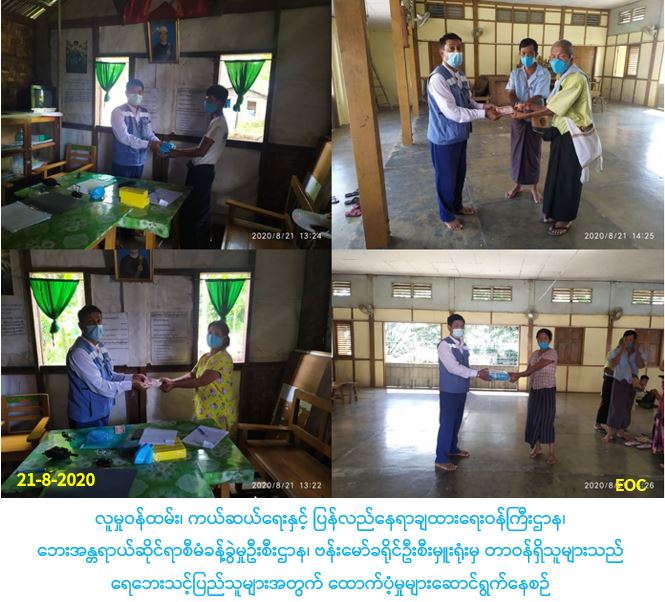 လူမှုဝန်ထမ်း၊ ကယ်ဆယ်ရေးနှင့် ပြန်လည်နေရာချထားရေးဝန်ကြီးဌာန၊ ဘေးအန္တရာယ်ဆိုင်ရာစီမံခန့်ခွဲမှုဦးစီးဌာန၊ ဗန်းမော်ခရိုင်ဦးစီးမှူးရုံးမှ တာဝန်ရှိသူများသည် (၁၉-၈-၂၀၂၀) ရက်နေ့ မှ (၂၀-၈-၂၀၂၀) ရက်နေ့အထိ ဧရာဝတီမြစ်ရေမြင့်တက် လာမှုကြောင့် မင်းကျောင်းကုန်းရပ်ကွက်နှင့် အလယ်ရပ်ရပ်ကွက်တို့မှ ပြောင်းရွှေ့အိမ်ထောင်စု (၄၀) စု၊ လူဦးရေ (၁၅၆) ဦးတို့ အတွက် ဆပ်ပြာ (၄၀) ခဲ၊ အဝတ်mask (၁၅၆) ခုနှင့် ဆန်ရိက္ခာ (၇) ရက်စာဖိုးထောက်ပံ့ငွေ (၃၂၇၆၀၀/-) ကျပ် တို့ကို (၂၁-၈-၂၀၂၀) ရက်နေ့ (၁၄:၀၀) နာရီအချိန်တွင် သွားရောက်ထောက်ပံ့ခဲ့ပါကြောင်း သတင်းရရှိပါသည်။