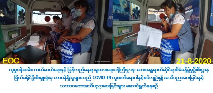 လူမှုဝန်ထမ်း၊ ကယ်ဆယ်ရေးနှင့် ပြန်လည်နေရာချထားရေးဝန်ကြီးဌာန၊ ဘေးအန္တရာယ် ဆိုင်ရာစီမံခန့်ခွဲမှုဦးစီးဌာန၊ မြိတ်ခရိုင်ဦးစီးမှူးရုံးမှ တာဝန်ရှိသူများသည် (၂၁-၈-၂၀၂၀) ရက်နေ့တွင် မြိတ်သံသရာအေးအထောက်အကူပြုလူမှုကူညီရေးအသင်း ပရဟိတအဖွဲ့တို့နှင့် ပူးပေါင်း၍ ငါးလေလံဈေး၊ အောင်မင်္ဂလာဈေး၊ ဆိပ်ငယ်ဘောတံတား၊ ကမ်းနားလမ်း၊ တိုးချဲ့ဈေး၊ လေယာဉ်ကွင်းလမ်းဆုံတို့တွင် COVID-19 အသက်ရှူလမ်းကြောင်းဆိုင်ရာ ရောဂါနှင့် ပတ်သက်၍ အများပြည်သူသိရှိလိုက်နာနိုင်ရန် ကျန်းမာရေးနှင့် အားကစား ဝန်ကြီး ဌာနက ထုတ်ပြန်ထားသော အသိပေးကြေညာချက်များနှင့် မိုးကြိုးဘေး၊ ရေဘေး၊ လေပြင်းဘေး ဆောင်ရန်/ရှောင်ရန်များ အသိပညာပေးခြင်းလုပ်ငန်းများအား ဆောင်ရွက်ခဲ့ ပါကြောင်း သတင်းရရှိပါသည်။