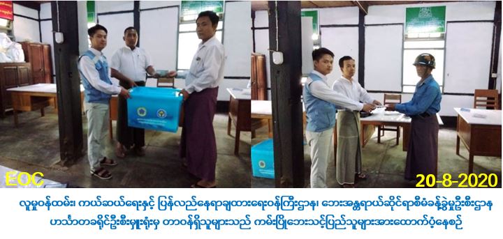 လူမှုဝန်ထမ်း၊ ကယ်ဆယ်ရေးနှင့် ပြန်လည်နေရာချထားရေးဝန်ကြီးဌာန၊ ဘေးအန္တရာယ် ဆိုင်ရာစီမံခန့်ခွဲမှုဦးစီးဌာန၊ ဟင်္သာတခရိုင်ဦးစီးမှူးရုံးမှ တာဝန်ရှိသူများသည် မြန်အောင် မြို့နယ်၊ ရွှေကျင်အုပ်စု၊ ဘုရားလှကျေးရွာတွင် (၁၇-၈-၂၀၂၀) ရက်နေ့တွင် ဖြစ်ပွားခဲ့သော ကမ်းပြိုဘေးကြောင့် ကြိုတင်ရွှေ့ပြောင်းရသော အိမ်ခြေ/အိမ်ထောင်စု (၃) စုအတွက် အိမ်ဆောက်ပစ္စည်းဖိုးရန်ပုံငွေ (၃၀၀,၀၀ဝိ/-) ကျပ်၊ လူဦးရေ(၉)ဦးအတွက် ဆန်ရိက္ခာ (၇) ရက်စာရန်ပုံငွေ (၁၈၉၀ဝိ/-) ကျပ်၊ စုစုပေါင်းရန်ပုံငွေ (၃၁၈,၉၀ဝိ/-) ကျပ်ကိုလည်းကောင်း၊ မြန်အောင်မြို့နယ်၊ သပြေကုန်းအုပ်စု၊ မြောက်ချောကုန်းကျေးရွာတွင် (၁၇-၈-၂၀၂၀) ရက်နေ့တွင် ဖြစ်ပွားခဲ့သော လေဘေးကြောင့် တစ်စိတ်တစ်ပိုင်းပျက်စီးသော အိမ်ခြေ/အိမ်ထောင်စု (၁) စုအတွက် အိမ်ဆောက်ပစ္စည်းဖိုးရန်ပုံငွေ(၇၀,၀၀ဝိ/-) ကျပ်၊ လူဦးရေ(၂) ဦးအတွက် ဆန်ရိက္ခာ(၇)ရက်စာရန်ပုံငွေ (၄,၂၀ဝိ/-) ကျပ်၊ စုစုပေါင်းရန်ပုံငွေ (၇၄,၂၀ဝိ/-) ကျပ်ကိုလည်းကောင်း၊ မြန်အောင်မြို့နယ်၊ ထူကျေးရွာအုပ်စု၊ ကြခတ်ကွင်းကျေးရွာတွင် (၁၇-၈-၂၀၂၀) ရက်နေ့တွင် ဖြစ်ပွားခဲ့သော လေဘေးကြောင့် ပြိုကျပျက်စီးသော အိမ်ခြေ/အိမ်ထောင်စု(၁)စုအတွက် အိမ်ဆောက်ပစ္စည်းဖိုးရန်ပုံငွေ(၂၀၀,၀၀ဝိ/-) ကျပ်၊ ကယ်ဆယ်ရေး ပစ္စည်း (၁၆)မျိုး ၊ လူဦးရေ(၃)ဦးအတွက် ဆန်ရိက္ခာ(၇)ရက်စာရန်ပုံငွေ (၆,၃၀ဝိ/-) ကျပ်၊ စုစုပေါင်းရန်ပုံငွေ (၂၀၆,၃၀ဝိ/-) ကျပ်ကိုလည်းကောင်း (၂၀-၈-၂၀၂၀)ရက်နေ့၊ (၁၂:၃၀) နာရီ အချိန်တွင် မြန်အောင်မြို့နယ်အထွေထွေအုပ်ချုပ်ရေးဦးစီးဌာန၌ သက်ဆိုင်ရာတာဝန်ရှိသူ များနှင့်အတူ ထောက်ပံ့ပေးအပ်ခဲ့ကြောင်း သတင်းရရှိပါသည်။