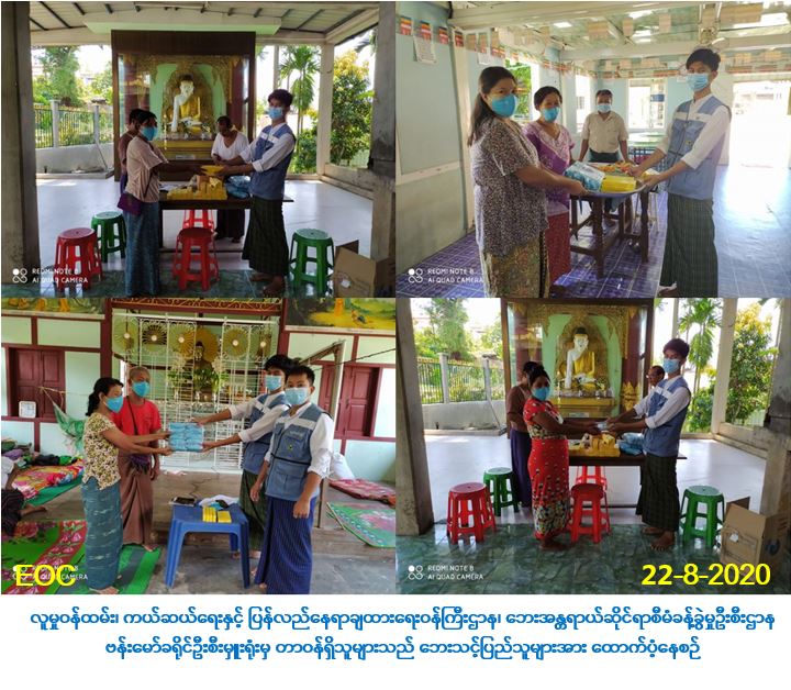 လူမှုဝန်ထမ်း၊ ကယ်ဆယ်ရေးနှင့် ပြန်လည်နေရာချထားရေးဝန်ကြီးဌာန၊ ဘေးအန္တရာယ် ဆိုင်ရာစီမံခန့်ခွဲမှုဦးစီးဌာန၊ ဗန်းမော်ခရိုင်ဦးစီးမှူးရုံးမှ တာဝန်ရှိသူများသည် (၁၉-၈-၂၀၂၀) ရက်နေ့မှ (၂၁-၈-၂၀၂၀)ရက်နေ့အထိ ဧရာဝတီမြစ်ရေမြင့်တက်လာမှုကြောင့် ခွန်သာ ရပ်ကွက်နှင့် ပေါက်ကုန်းရပ်ကွက်တို့မှ ပြောင်းရွှေ့အိမ်ထောင်စု (၂၁၅)စု၊ လူဦးရေ (၉၇၉) ဦးတို့အတွက် ဆပ်ပြာ(၂၁၅)ခဲ၊ အဝတ်mask(၉၇၉)ခုနှင့် (၇)ရက်စာဆန်ဖိုးထောက်ပံ့ငွေ (၂,၀၅၅,၉၀၀/-) ကျပ်တို့ကို (၂၂-၈-၂၀၂၀)ရက်နေ့၊ (၁၅:၀၀)နာရီအချိန်တွင် သွားရောက် ထောက်ပံ့ခဲ့ကြောင်း သတင်းရရှိပါသည်။