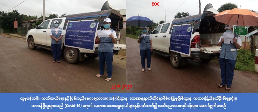 လူမှုဝန်ထမ်း၊ ကယ်ဆယ်ရေးနှင့်ပြန်လည်နေရာချထားရေးဝန်ကြီးဌာန၊ ဘေးအန္တရာယ်ဆိုင်ရာစီမံခန့်ခွဲမှု ဦးစီးဌာန၊ ကယားပြည်နယ်ဦးစီးမှူးရုံးမှတာဝန်ရှိသူများသည် (၂၂.၈.၂၀၂၀)ရက်နေ့တွင် လွိုင်ကော် မြို့နယ်၊ ပါလောင်းကျေးရွာအုပ်စု၊ ဒေါတရိုးကျးရွာ၊ ချိကယ်ကျေးရွာအုပ်စု၊ ဒေါကလိုးခူကျေးရွာ၊ နမ့်ကွမ့် ကျေးရွာ၊ ဒေါဆော်ဘီကျေးရွာများရှိ ပြည်သူများအား (COVID-19)ကူးစက်ရောဂါ ပြန့်ပွားမှုမဖြစ်ပွား စေရန်အတွက် သိရှိလိုက်နာရန်အချက်များနှင့် သဘာဝဘေးအန္တရာယ်နှင့်စပ်လျဉ်းသည့် ဆောင်ရန်၊ ရှောင်ရန်များကို အသိပညာဖြန့်ဝေခဲ့ကြောင်း သိရှိရပါသည်။