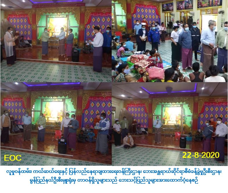 လူမှုဝန်ထမ်း၊ ကယ်ဆယ်ရေးနှင့် ပြန်လည်နေရာချထားရေးဝန်ကြီးဌာန၊ ဘေးအန္တရာယ် ဆိုင်ရာစီမံခန့်ခွဲမှုဦးစီးဌာန၊ မွန်ပြည်နယ်ဦးစီးမှူးရုံးမှ တာဝန်ရှိသူများသည် (၂၂-၈-၂၀၂၀) ရက်နေ့၊ မိုးသည်းစွာရွာသွန်းမှုကြောင့် မွန်ပြည်နယ်၊ မုဒုံမြို့၊ မြို့မ(၂) ရပ်ကွက်မှ ရေဘေး ရှောင်ယာယီပြောင်းရွှေ့နေထိုင်သူ အိမ်ထောင်စု (၁၁၂) စု၊ လူဦးရေ (၄၈၇) ဦးတို့အား (၇) ရက်စာဆန်ရိက္ခာဖိုးထောက်ပံ့ငွေ (၁,၀၂၂,၇၀၀/-)ကျပ်နှင့် Surgical Mask (၅၀၀)ခု၊ Hand Gel (၁၀) ဗူးတို့အား (၂၃-၈-၂၀၂၀) ရက်နေ့၊ နံနက် (၁၀)နာရီအချိန်ခန့်တွင် မွန်ပြည်နယ် ဝန်ကြီးချုပ်နှင့်အတူ သွားရောက်ကြည့်ရှု့ထောက်ပံ့ပေးခဲ့ကြောင်း သတင်းရရှိပါသည်။