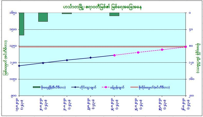ယနေ့မြန်မာစံတော်ချိန် (၁၂:၃၀)နာရီအချိန် တိုင်းထွာချက်အရ ဧရာဝတီမြစ်ရေသည် ဟင်္သာတ မြို့တွင် (၂)ပေခွဲခန့် ယင်းမြို့၏ စိုးရိမ်ရေမှတ်အောက်တွင် ရောက်ရှိနေပါသည်။ အဆိုပါမြစ်ရေသည် နောက်(၃)ရက်အတွင်း ယင်းမြို့၏ စိုးရိမ်ရေမှတ်သို့ ရောက်ရှိနိုင်ပါသည်။