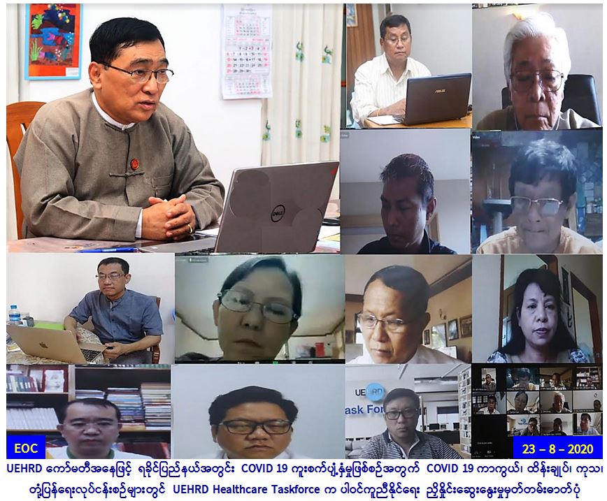 ရခိုင်ပြည်နယ်အတွင်း လူသားချင်းစာနာမှု အကူအညီ အထောက်အပံ့ပေးရေး၊ ပြန်လည်နေရာချထား ရေးဖွံ့ဖြိုးရေးစီမံကိန်း (UEHRD) ကော်မတီအနေဖြင့် ရခိုင်ပြည်နယ် အတွင်း COVID 19 ကူးစက်ပျံ့နှံမှုဖြစ်စဉ်အတွက် COVID 19 ကာကွယ်၊ ထိန်းချုပ်၊ ကုသ၊ တုံ့ပြန်ရေး လုပ်ငန်းစဉ်များတွင် UEHRD Healthcare Taskforce က ပါဝင်ကူညီနိုင်ရေး ညှိနှိုင်းဆွေးနွေးခြင်းကို ယနေ့နံနက်ပိုင်းက Video Conferencing စနစ်ဖြင့် ကျင်းပပြုလုပ်ခဲ့ပါသည်။
