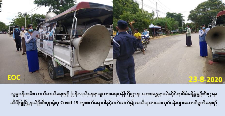 လူမှုဝန်ထမ်း၊ ကယ်ဆယ်ရေးနှင့် ပြန်လည်နေရာချထားရေးဝန်ကြီးဌာန၊ ဘေးအန္တရာယ်ဆိုင်ရာ စီမံခန့်ခွဲမှုဦးစီးဌာန၊ မကွေးတိုင်းဒေသကြီး၊ ပခုက္ကူခရိုင်၊ ဆိပ်ဖြူမြို့နယ်ဦးစီးမှူးရုံးမှ တာဝန်ရှိ သူများသည် မြို့နယ်အထွေထွေအုပ်ချုပ်ရေးဦးစီးဌာနမှ မြို့နယ်အုပ်ချုပ်ရေးမှူး၊ ပြန်ကြားရေးနှင့် ပြည်သူ့ဆက်ဆံရေးဦးစီးဌာနမှ တာဝန်ရှိသူများ၊ မီးသတ်ဦးစီးဌာနမှ တာဝန်ရှိသူများ၊ မြန်မာနိုင်ငံရဲတပ်ဖွဲ့မှ တာဝန်ရှိသူများ၊ စီးပွားရေးနှင့် ကူးသန်းရောင်းဝယ်ရေးဝန်ကြီးဌာနမှ တာဝန်ရှိသူများ၊ မြို့နယ်စည်ပင်သာယာရေးအဖွဲ့မှ တာဝန်ရှိသူများနှင့်အတူ ပူးပေါင်းပြီး (၂၃-၈-၂၀၂၀)ရက်နေ့၊ (၁၀:၀၀)နာရီအချိန်မှ (၁၂:၀၀)နာရီအချိန်ထိ ဆိပ်ဖြူမြို့နယ်အတွင်းရှိ ယောဝရပ်ကွက်၊ အနောက်ပိုင်းရပ်ကွက်နှင့် အလယ်ပိုင်းရပ်ကွက်တို့တွင်လည်းကောင်း (၁၆:၀၀)နာရီအချိန်မှ (၁၈:၀၀)နာရီအချိန်ထိ ရွာသစ်ရပ်ကွက်၊ ကိုးတောင့်ကျေးရွာနှင့် ကမ္ဘားကြီးကျေးရွာတို့တွင်လည်းကောင်း Covid-19 ရောဂါနှင့်ပတ်သက်၍ ကာကွယ်၊ တားဆီး၊ ထိန်းချုပ်ကုသရေးဆိုင်ရာ အသိပညာပေးပန်ကြားချက်များကို လှည့်လည်ဟောပြောခြင်း၊ လက်ကမ်းစာစောင်များ ဖြန့်ဝေခြင်းနှင့် Maskများ ဖြန့်ဝေခြင်းတို့ကို ဆောင်ရွက်ခဲ့ပါကြောင်း သတင်းရရှိပါသည်။