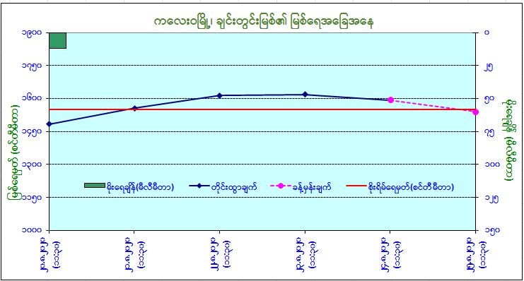ယနေ့မြန်မာစံတော်ချိန် (၁၁:၃၀)နာရီအချိန် တိုင်းထွာချက်အရ ချင်းတွင်းမြစ် ရေသည် ကလေးဝမြို့တွင် (၁)ပေခွဲခန့် ယင်းမြို့၏ စိုးရိမ်ရေမှတ်အထက်သို့ ကျော်လွန်ရောက်ရှိနေပါသည်။ အဆိုပါမြစ်ရေသည် နောက်(၁)ရက်အတွင်း ယင်းမြို့၏ စိုးရိမ်ရေမှတ်အောက် ပြန်လည်ကျဆင်းနိုင်ပါသည်။