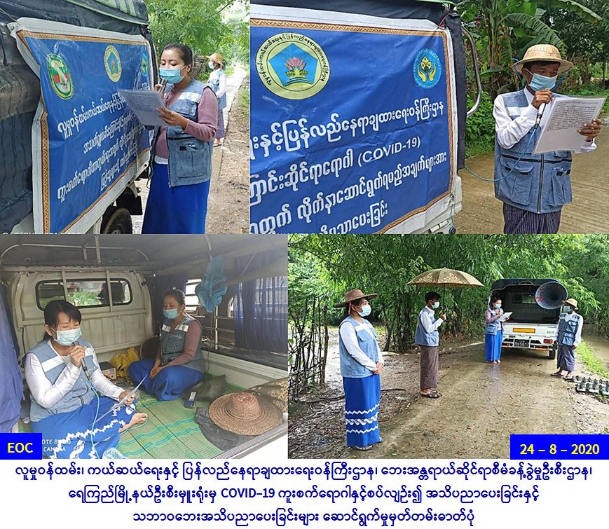 လူမှုဝန်ထမ်း၊ ကယ်ဆယ်ရေးနှင့် ပြန်လည်နေရာချထားရေး ဝန်ကြီးဌာန၊ ဘေးအန္တရာယ်ဆိုင်ရာစီမံခန့်ခွဲမှုဦးစီးဌာန၊ ရေကြည် မြို့နယ်ဦးစီးမှူးရုံးမှ တာဝန်ရှိသူများသည် (၂၄-၈-၂၀၂၀)ရက်နေ့၊ (၀၉:၃၀)နာရီအချိန်မှစ၍ ရေကြည်မြို့နယ်၊ ညောင်ပင် သာယာကျေးရွာအုပ်စု၊ ညောင်ပင်စုကျေးရွာ၊ ညောင်ပင်သာကျေးရွာ၊ ဥရှစ်ကုန်းကျေးရွာနှင့် ကြာအင်းကုန်းကျေးရွာတို့တွင် Covid-19 ဒုတိယလှိုင်းကူးစက်မှုမဖြစ်ပွားစေရန်နှင့် သဘာဝဘေးနှင့်ပတ်သက်သည့် ဆောင်ရန်/ရှောင်ရန်များကို ကျေးရွာ/ ရပ်ကွက်နေ မိဘပြည်သူတို့အား အသိပညာပေးဟောပြော ဆောင်ရွက်ခဲ့ပါကြောင်း သတင်းရရှိပါသည်။