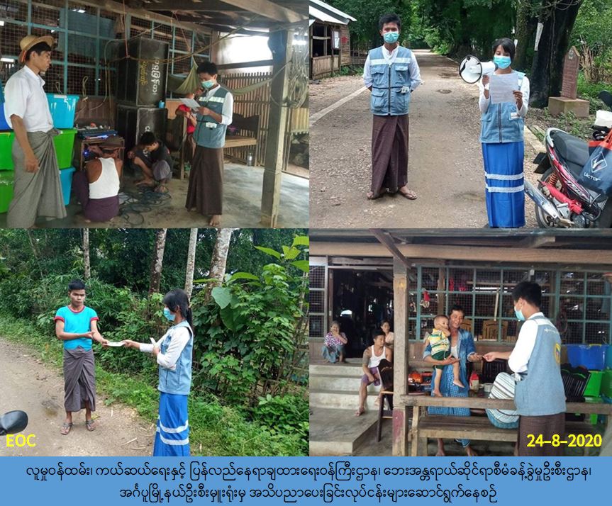 လူမှုဝန်ထမ်း၊ ကယ်ဆယ်ရေးနှင့်ပြန်လည်နေရာချထားရေးဝန်ကြီးဌာန၊ ဘေးအန္တရာယ်ဆိုင်ရာ စီမံခန့်ခွဲမှုဦးစီးဌာန၊ အင်္ဂပူမြို့နယ်ဦးစီးမှူးရုံးမှ တာဝန်ရှိသူများသည် (၂၄-၈-၂၀၂၀) ရက်နေ့ (၁၀:၃၀) နာရီအချိန်မှစ၍ ကြမ်းတမ်းကွင်းကျေးရွာအုပ်စု၊ ကြမ်းတမ်းကွင်းကျေးရွာ၊ ရေတွင်း လှကျေးရွာ၊ သခွပ်ကွင်းကျေးရွာ၊ လူပျိုတော်ကွင်းကျေးရွာ၊ ထိုးဘိုကျေးရွာ၊ ကျောင်းကုန်းကျေး ရွာများတွင် ကျန်းမာရေးနှင့်အားကစားဝန်ကြီးဌာနမှ ထုတ်ပြန်ထားသော Covid-19 ကူးစက်မှု ဒုတိယလှိုင်းမဖြစ်စေရန် အသိပညာပေးခြင်းလုပ်ငန်းများနှင့် ဧရာဝတီတိုင်းဒေကြီးCovid-19 ထိန်းချုပ်ရေးနှင့် အရေးပေါ်တုံ့ပြန်ရေးကော်မတီမှ ထုတ်ပြန်သည့်တားမြစ်မိန့်နှင့် ညွှန်ကြား ချက်များအားလည်းကောင်း၊ ရာသီအလိုက်ဖြစ်ပွားတတ်သော သဘာဝဘေးအန္တရာယ်များနှင့် ပတ်သက်သည့် သဘာဝဘေးအသိပညာပေးခဲ့ပြီး သဘာဝဘေးအသိပညာပေးလက်ကမ်းစာ စောင်များ ဝေငှဖြန့်ဝေခြင်းတို့အားလည်းကောင်း၊ အများပြည်သူများသိရှိလိုက်နာရန် ကွင်းဆင်း လှည့်လည်၍ အသိပညာပေးလုပ်ငန်းများ ပြုလုပ်ဆောင်ရွက်ခဲ့ပါကြောင်း သတင်းရရှိပါသည်။