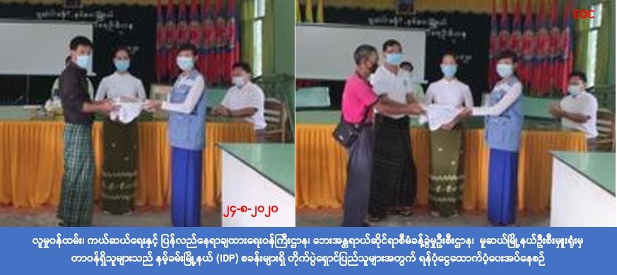 လူမှုဝန်ထမ်း၊ ကယ်ဆယ်ရေးနှင့် ပြန်လည်နေရာချထားရေးဝန်ကြီးဌာန၊ ဘေးအန္တရာယ်ဆိုင်ရာစီမံခန့်ခွဲမှုဦးစီးဌာန၊ မူဆယ်မြို့နယ်ဦးစီးမှူးရုံးမှ တာဝန်ရှိသူများသည် (၂၄-၈-၂၀၂၀)ရက်နေ့တွင် နမ့်ခမ်းမြို့နယ် အထွေထွေအုပ်ချုပ်ရေးဦးစီးဌာနရုံးခန်းမ၌ အထွေထွေအုပ်ချုပ်ရေး ဦးစီးဌာနမှတာဝန်ရှိသူများ၊ ဌာနဆိုင်ရာ တာဝန်ရှိသူများနှင့်အတူ နမ့်ခမ်းမြို့နယ်အတွင်းရှိ (IDPs) စခန်း(၆)ခုမှ တိုက်ပွဲရှောင် ပြည်သူ အိမ်ထောင်စု (၃၈၉)စုအတွက် (COVID-19) စီးပွားရေးကုစားမှု အစီအစဥ်(CERP)အရ စားသောက်ကုန်(၅)မျိုးဝယ်ယူနိုင်ရန် အတွက် အိမ်ထောင်စု (၁) စုလျှင် ထောက်ပံ့ငွေကျပ် (၄၀,၀၀၀)နှုန်းဖြင့် စုစုပေါင်းရန်ပုံငွေ (၁၅,၅၆၀,၀၀၀) ကျပ်တို့ကို စခန်းတာဝန်ခံများ မှတဆင့် တိုက်ပွဲရှောင်ပြည်သူများ လက်ဝယ်သို့ ထောက်ပံ့ပေးအပ် ခဲ့ကြောင်း သိရှိရပါသည်။