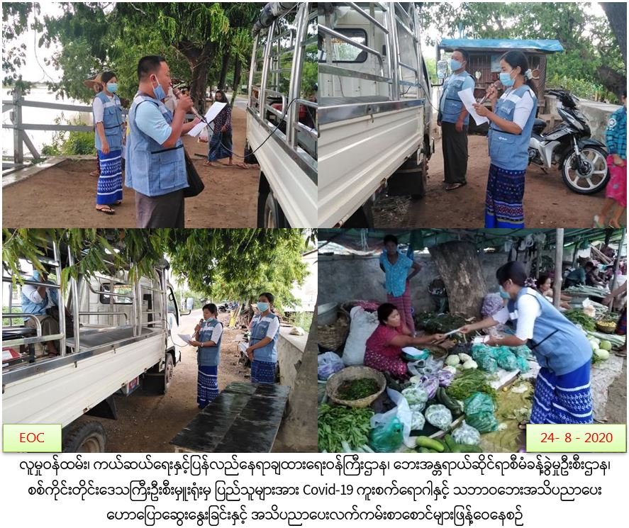 လူမှုဝန်ထမ်း၊ ကယ်ဆယ်ရေးနှင့်ပြန်လည်နေရာချထားရေးဝန်ကြီးဌာန၊ ဘေးအန္တရာယ်ဆိုင်ရာစီမံခန့်ခွဲမှုဦးစီးဌာန၊ စစ်ကိုင်းတိုင်းဒေသကြီးဦးစီးမှူးရုံးမှ (၂၄.၈.၂၀၂၀)ရက်နေ့ မုံရွာမြို့နယ်အတွင်းရှိ ထနောင်းတောကျေးရွာ၊ နဂါးတွင်းကျေးရွာ၊ ဘုဘကျေးရွာ၊ ညောက်ဖြူပင်ကျေးရွာ၊ ပေါက်ပင်ကျေးရွာများရှိ မိဘပြည်သူများအား COVID-19 ကူးစက်ရောဂါ အသိပညာပေးခြင်း၊ ရေဘေးအန္တရာယ် အသိပညာပေးခြင်းနှင့် ရေဘေးလက်ကမ်းစာစောင်ဖြန့်ဝေခြင်းများ ဆောင်ရွက်ခဲ့ကြောင်း သတင်းရရှိပါသည်။