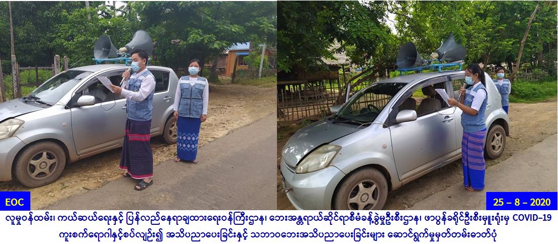 လူမှုဝန်ထမ်း၊ ကယ်ဆယ်ရေးနှင့် ပြန်လည်နေရာချထားရေး ဝန်ကြီးဌာန၊ ဘေးအန္တရာယ်ဆိုင်ရာစီမံခန့်ခွဲမှုဦးစီးဌာန၊ ဖာပွန်ခရိုင် ဦးစီးမှူးရုံးမှ တာဝန်ရှိသူများသည် (၂၅-၈-၂၀၂၀)ရက်နေ့၊ နံနက်(၀၈:၀၀)နာရီချိန်မှ (၁၁:၀၀)နာရီချိန်ထိ ဖာပွန်ခရိုင်၊ ဖာပွန်မြို့ အတွင်းရှိ ကတိုင်တိကျေးရွာ၊ ကကိုင်းဘောကျေးရွာ၊ ကကူလားကျေးရွာ၊ ဝှေဆန်ကျေးရွာနှင့် ကူးဆိပ်ကျေးရွာများတွင် COVID-19 ကူးစက်မြန်ရောဂါပြန့်ပွားမှုများ မဖြစ်ပွားစေရန်အတွက် သိရှိလိုက်နာရမည့်အချက်များနှင့် မိုးရာသီကာလအတွင်း ဖြစ်ပွား တတ်သော သဘာဝဘေးအန္တရာယ်များနှင့်စပ်လျဥ်း၍ ဆောင်ရန်/ရှောင်ရန် အချက်များအား အသံချဲ့စက်ဖြင့်အသိပညာပေး ဆောင်ရွက်ခဲ့ပါကြောင်း သတင်းရရှိပါသည်။