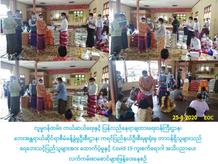 လူမှုဝန်ထမ်း၊ ကယ်ဆယ်ရေးနှင့် ပြန်လည်နေရာချထားရေးဝန်ကြီးဌာန၊ ဘေးအန္တရာယ်ဆိုင်ရာစီမံခန့်ခွဲမှုဦးစီးဌာန၊ ကရင်ပြည်နယ်ဦးစီးမှူးရုံးမှ တာဝန်ရှိသူများသည် ကရင်ပြည်နယ် လွှတ်တော်ဥက္ကဌနှင့်အတူ လှိုင်းဘွဲ့မြို့အတွင်းရှိ ရေဘေးရှောင် အိမ်ထောင်စု(၃၃၀)စုမှ လူဦးရေ(၁၅၇၆)ဦးအတွတ် ဆန်ရိက္ခာ(၇)ရက်စာဖိုးထောက်ပံ့ငွေ (၃၃၀၉၆၀၀/-)ကျပ်နှင့် အိမ်ထောင်စု (၃၃၀)စုအတွတ် ဆပ်ပြာ(၃၃၀)ထောင့်တို့အား (၂၅-၈-၂၀၂၀) ရက်နေ့ မနက်(ဝ၉:၀၀)နာရီအချိန်တွင် ထောက်ပံ့ပေးအပ်ခဲ့ပြီး ရေဘေးအန္တရာယ်နှင့် Covid-19ကူးစက်ရောဂါ အသိပညာပေး လက်ကမ်းစာစောင်များအား ဖြန့်ဝေးပေးခဲ့ပါကြောင်း သတင်းရရှိ ပါသည်။